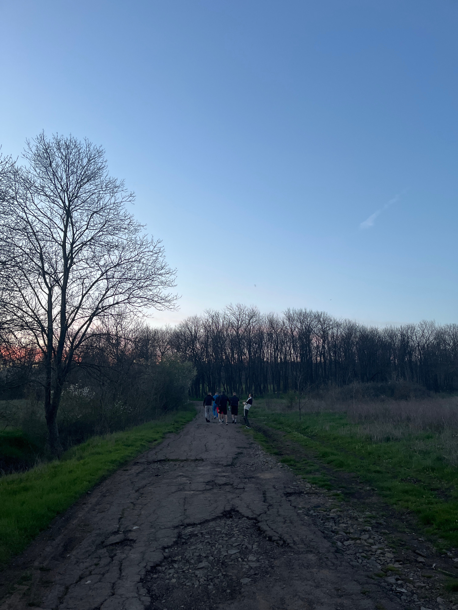 The image depicts an outdoor scene, likely a park or wooded area, in Burgas, Bulgaria. A cracked, unpaved path runs through the center, bordered by green grass on one side and a dense line of bare treβ¦read more