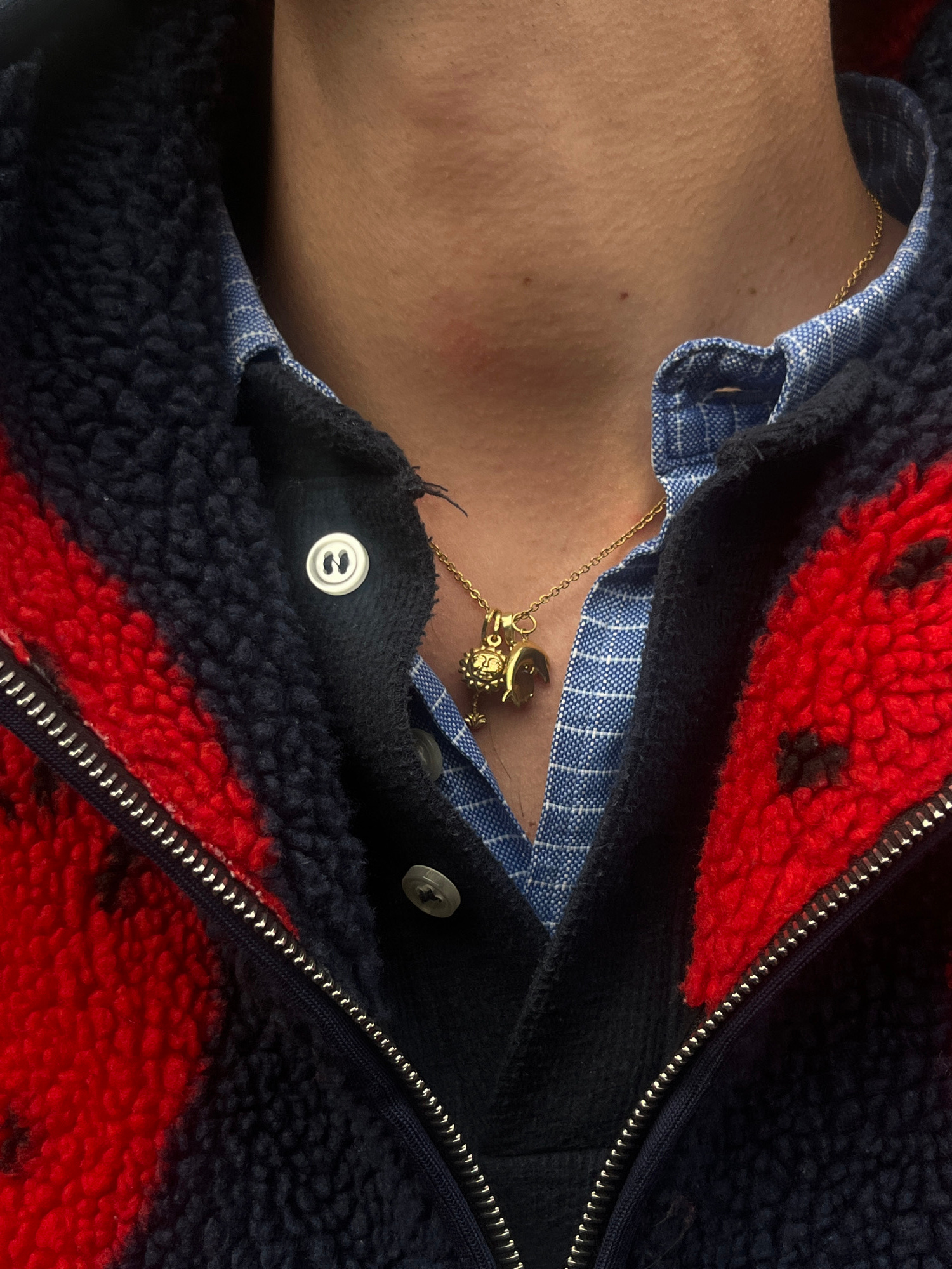 A close-up shot of a person's upper chest and neck area is visible. The person is wearing a light blue, button-down shirt with a subtle checkered pattern. Over the shirt, there's a fleece jacket or ve…read more