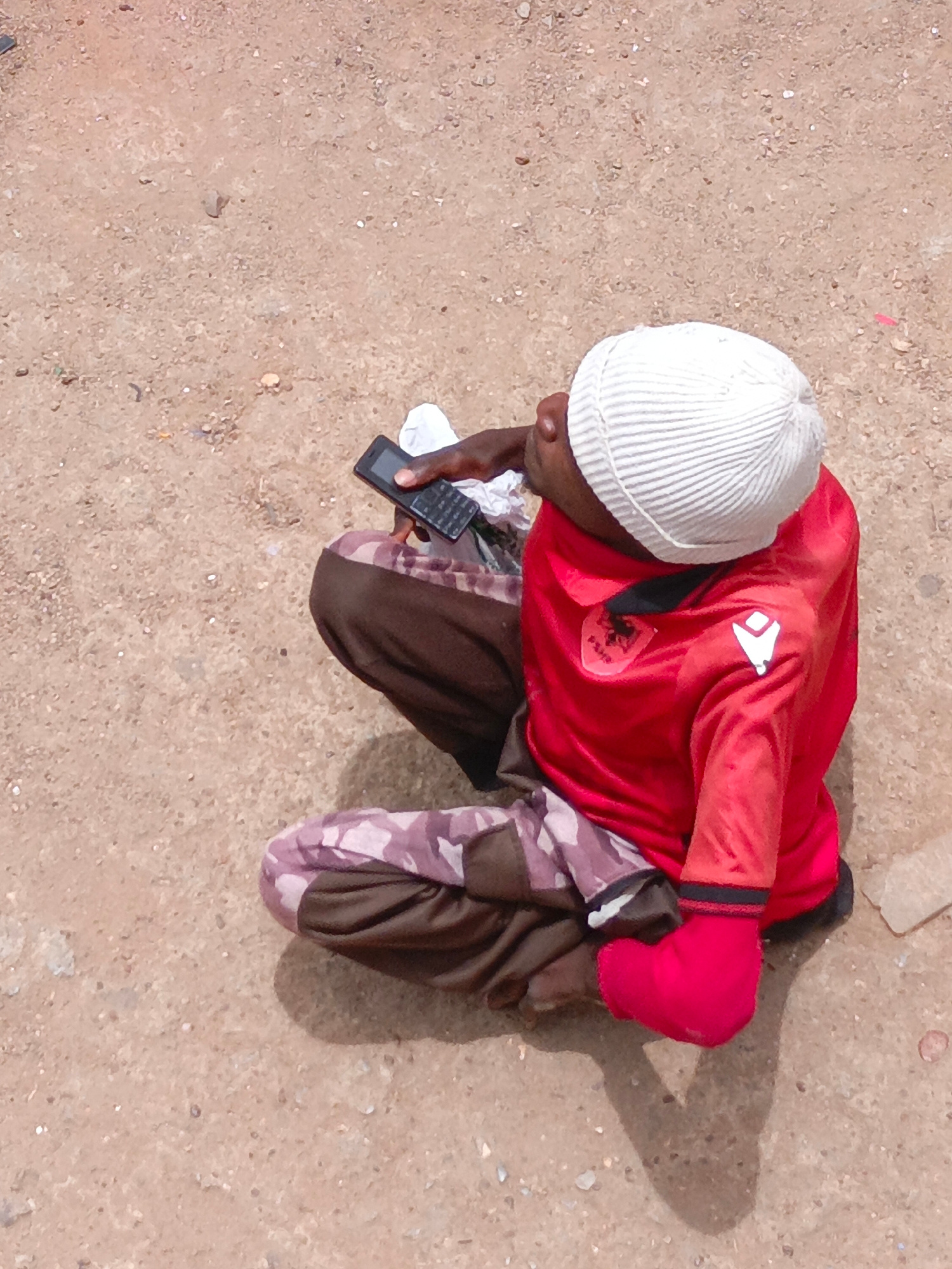 In a medium shot taken from above, a young man is seated cross-legged on a sandy ground. He is wearing a white ribbed beanie, a red long-sleeved shirt with an Albanian emblem, and brown and camouflage…read more
