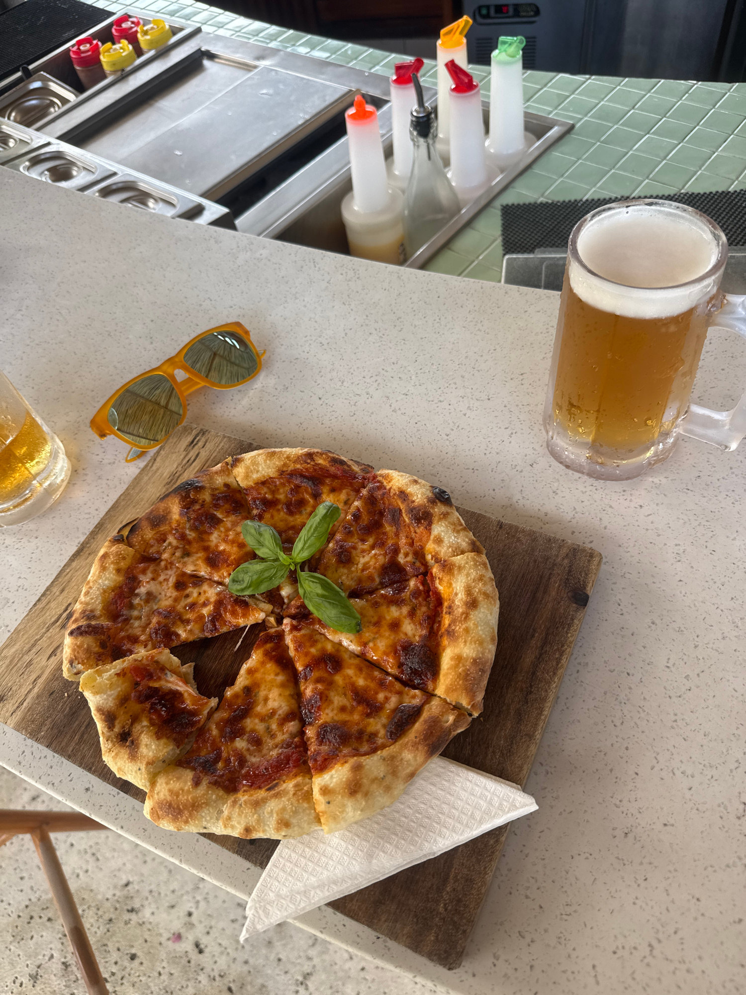 On a speckled, light-colored countertop, likely indoors, a high-angle shot displays a casual dining scene. The countertop could be made from granite or a similar material. A partially consumed pizza,…read more