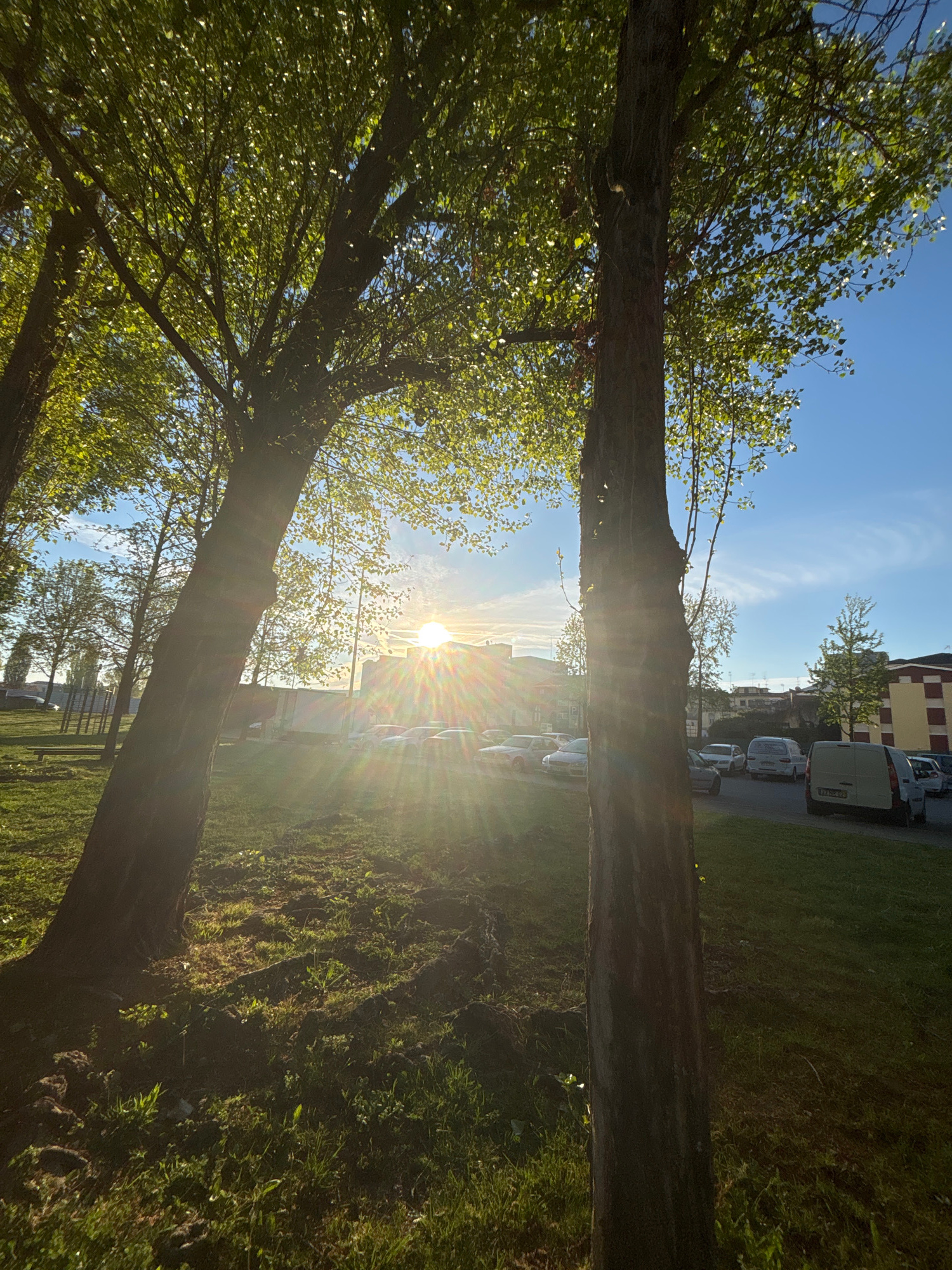 The image depicts a view between two tree trunks in Mirandela, Portugal. The sun shines brightly between the trunks. Green foliage is visible on the trees. Buildings and parked vehicles are in the bac…read more