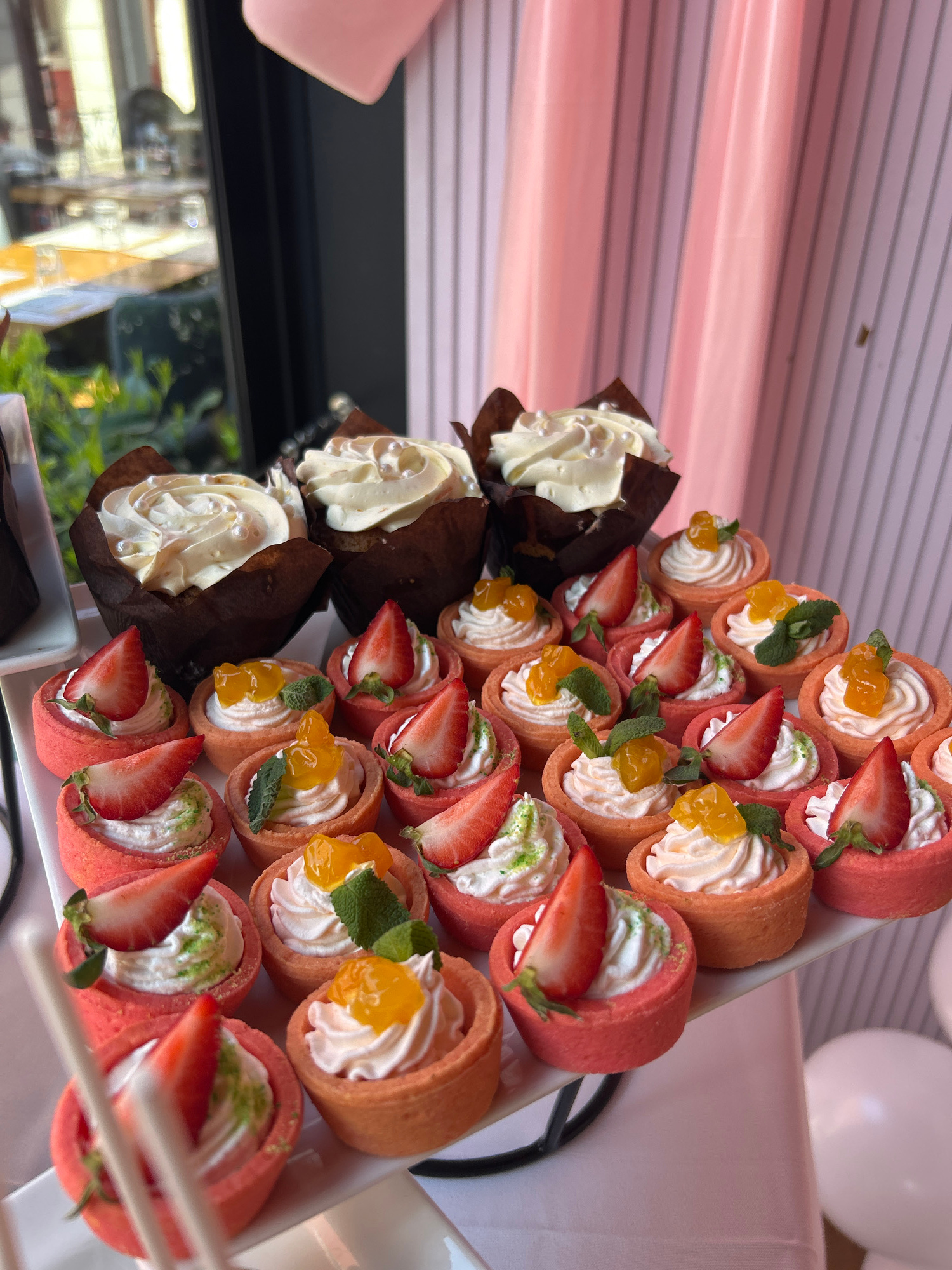 This image captures a vibrant, high-angle view of a dessert display, likely at a celebration or catered event in Plovdiv, Bulgaria. The central subjects are numerous miniature cone-shaped pastries, po…read more
