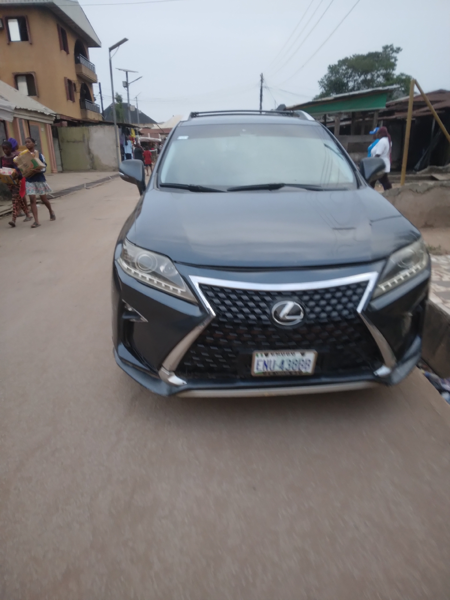 The image shows a gray Lexus SUV parked on a paved road in Onitsha, Nigeria. The front of the vehicle is prominently displayed, showing the grille, headlights, and license plate with the inscription "ENU-4388BG". In the background, there are buildings, utility poles, and people walking. The overall setting appears to be a residential or commercial street within the city. The sky is overcast, suggesting it might be early morning or late afternoon. | Open Wire