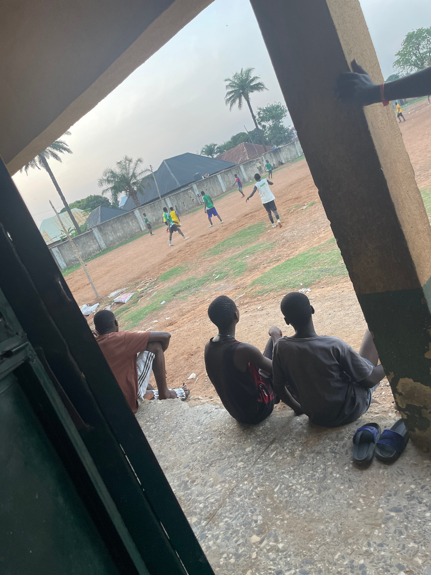 The image captures an outdoor scene in Akwanga, Nigeria, viewed from inside a building or shaded area. The perspective looks out over a dusty, open field bordered by simple buildings and palm trees.…read more