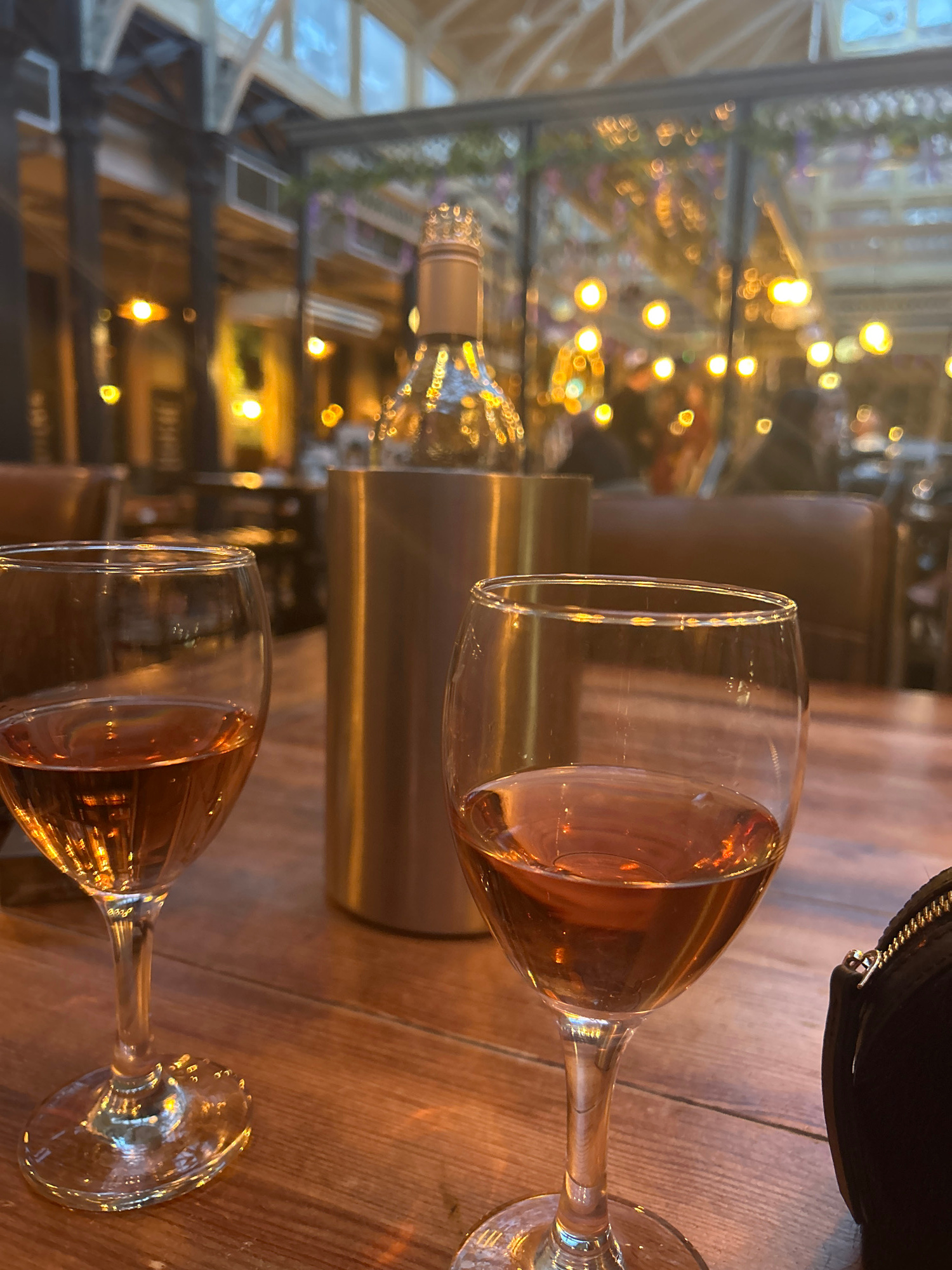 The image depicts two wine glasses filled with a light rosé liquid on a wooden table surface. A metal ice bucket with a wine bottle inside sits behind the glasses. The blurry background showcases a bu…read more