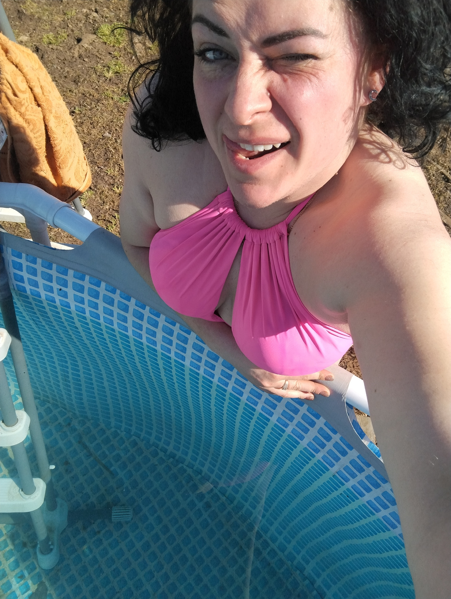 A woman with dark curly hair, wearing a pink swimsuit, winks at the camera while standing next to a blue and white above-ground pool. A yellow towel is draped over the pool's edge in the background. T…read more