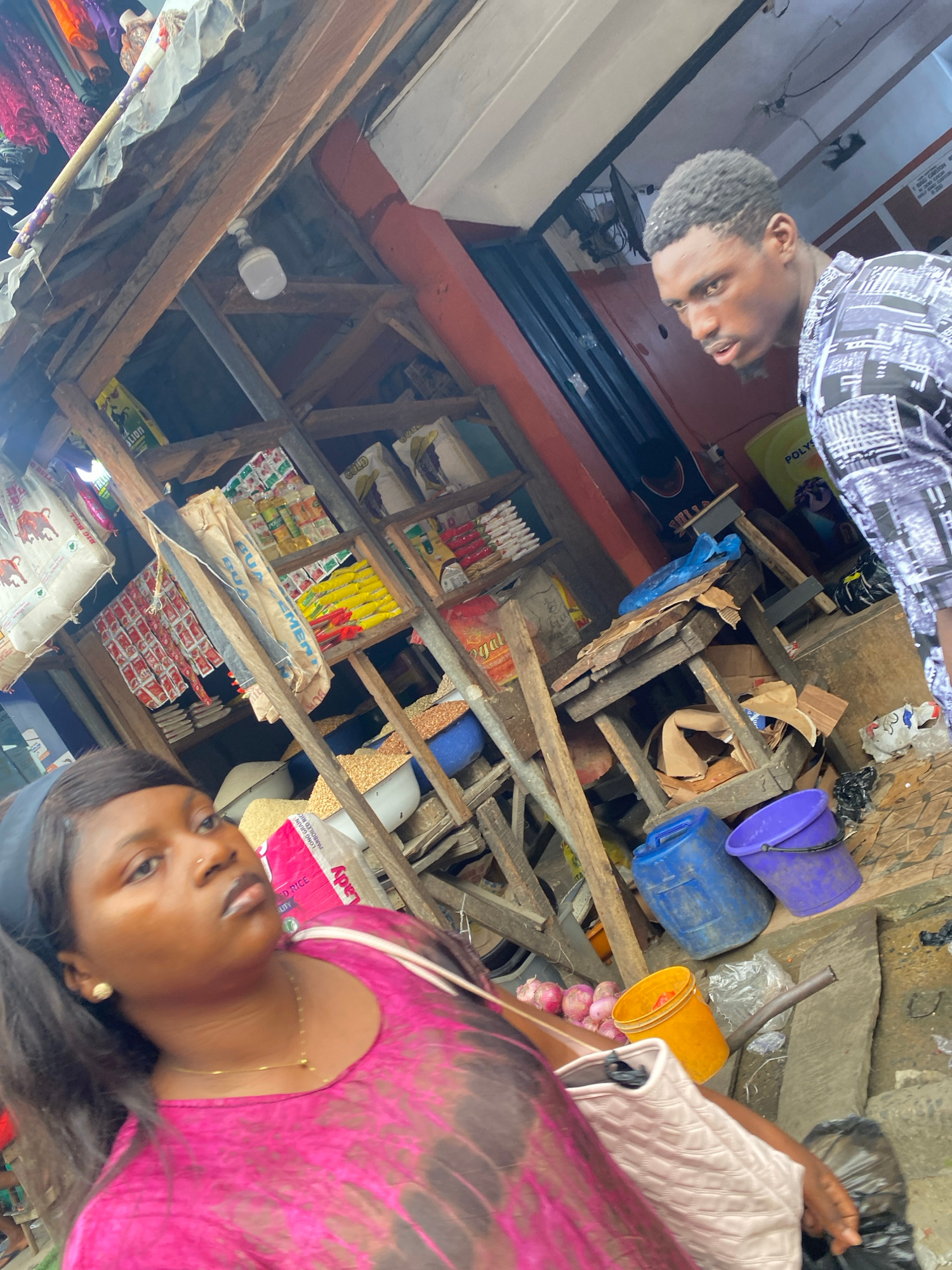 The image shows an indoor scene in Lekki, Nigeria. Two individuals are visible: a person wearing a patterned black and white shirt and another wearing a pink top. They appear to be standing within wha…read more