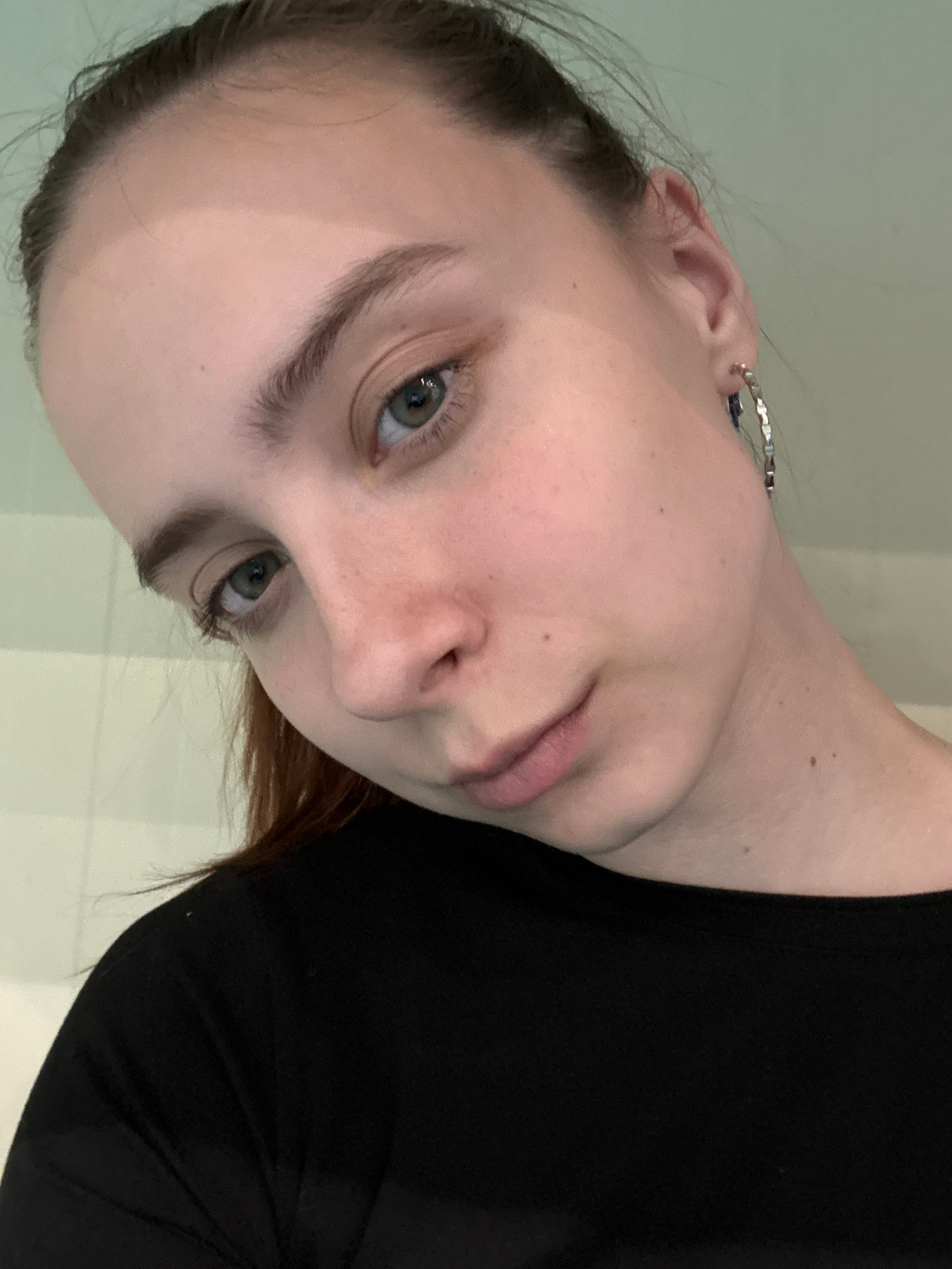 A close-up, portrait-style photograph shows a young person, likely female, with fair skin, light-colored eyes (appearing blue or green), and reddish-brown hair. The image is rotated 90 degrees clockwi…read more