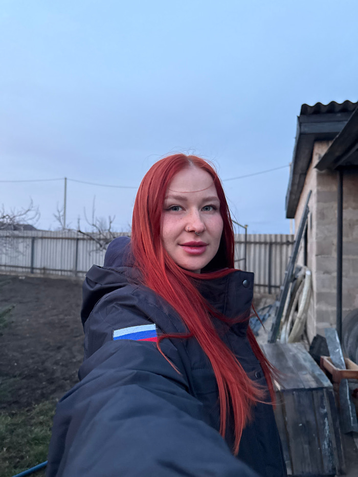 A female individual with long, straight, vibrant red hair and a nose (septum) piercing is captured in a direct-to-camera photograph, likely a selfie, outdoors in Makiivka, Ukraine. She is wearing a da…read more