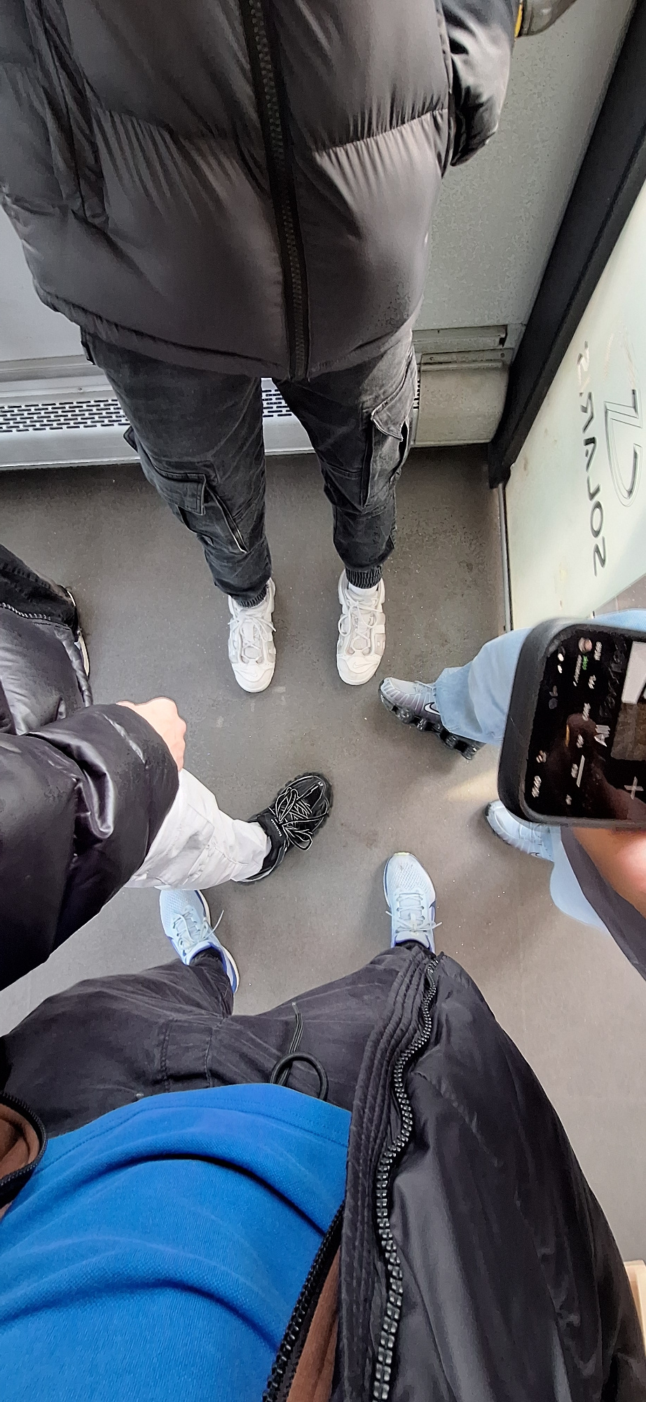 The image shows a group of people standing indoors, with a top-down perspective focused on their feet and lower bodies. They appear to be in a semi-circle. The individuals are wearing a variety of cas…read more