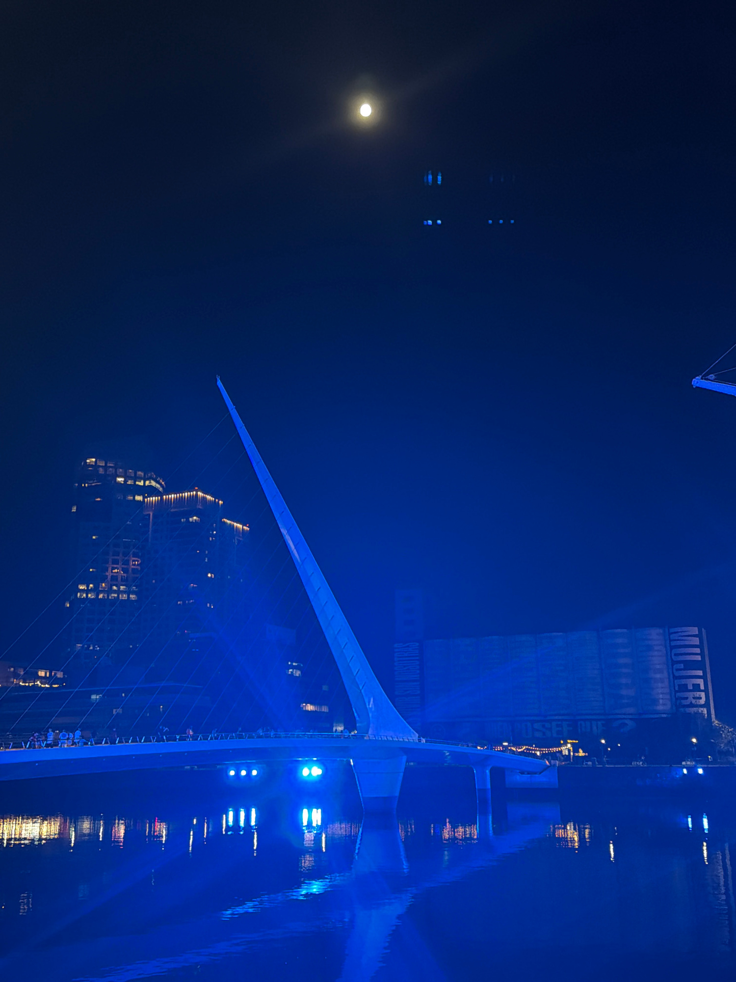 The image depicts the Puente de la Mujer (Woman's Bridge) in Buenos Aires, Argentina, at night. The bridge, illuminated with blue light, is reflected in the water below. A full moon is visible in the…read more