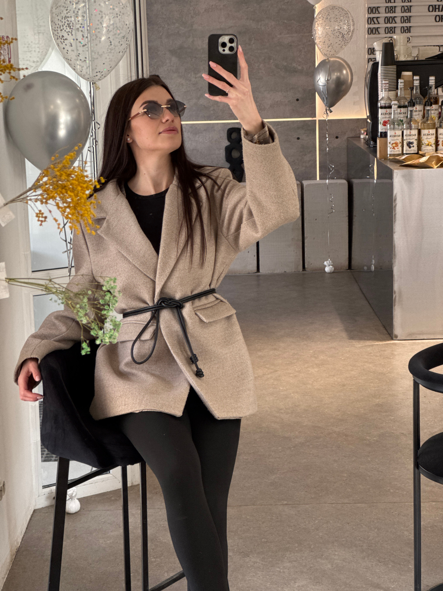 A woman wearing sunglasses, a beige coat with a black drawstring, and black leggings is taking a selfie. She is holding a smartphone in her left hand. Two balloons, one silver and one clear with silve…read more