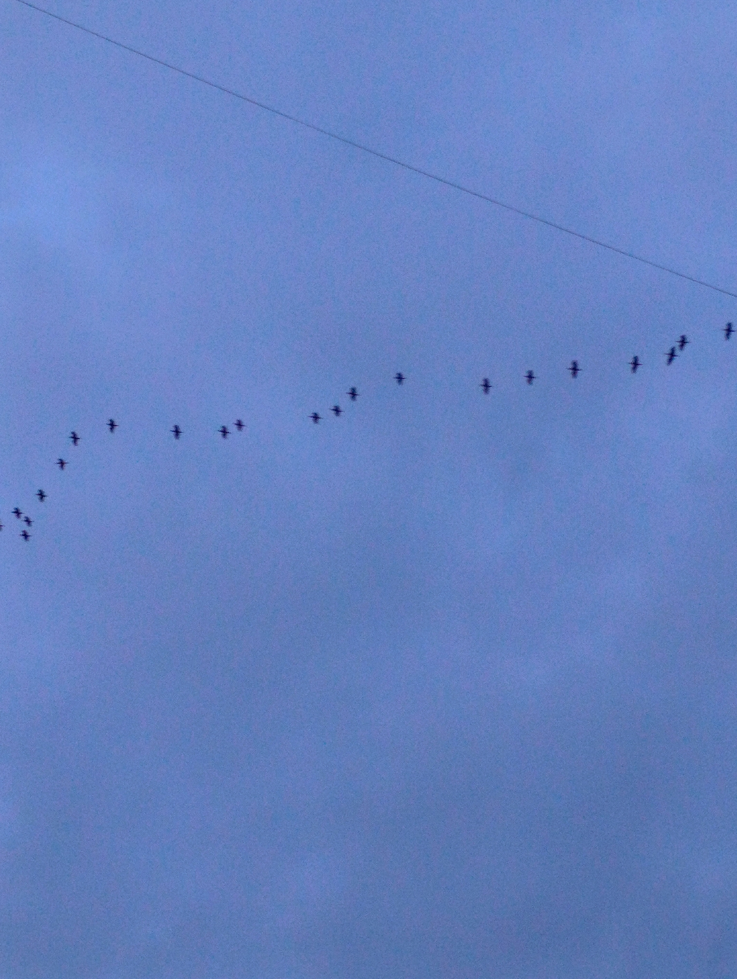 A flock of birds flies in a V-formation across a muted blue sky. A thin, dark wire stretches across the upper portion of the frame. The location, Kardzhali, Bulgaria is not directly discernible from t…read more