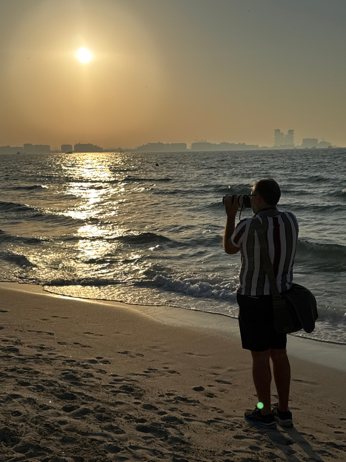 A male individual, viewed from behind, stands on a sandy beach in Dubai, United Arab Emirates. He is actively photographing the seascape with a black DSLR camera fitted with a long telephoto lens, hel…read more