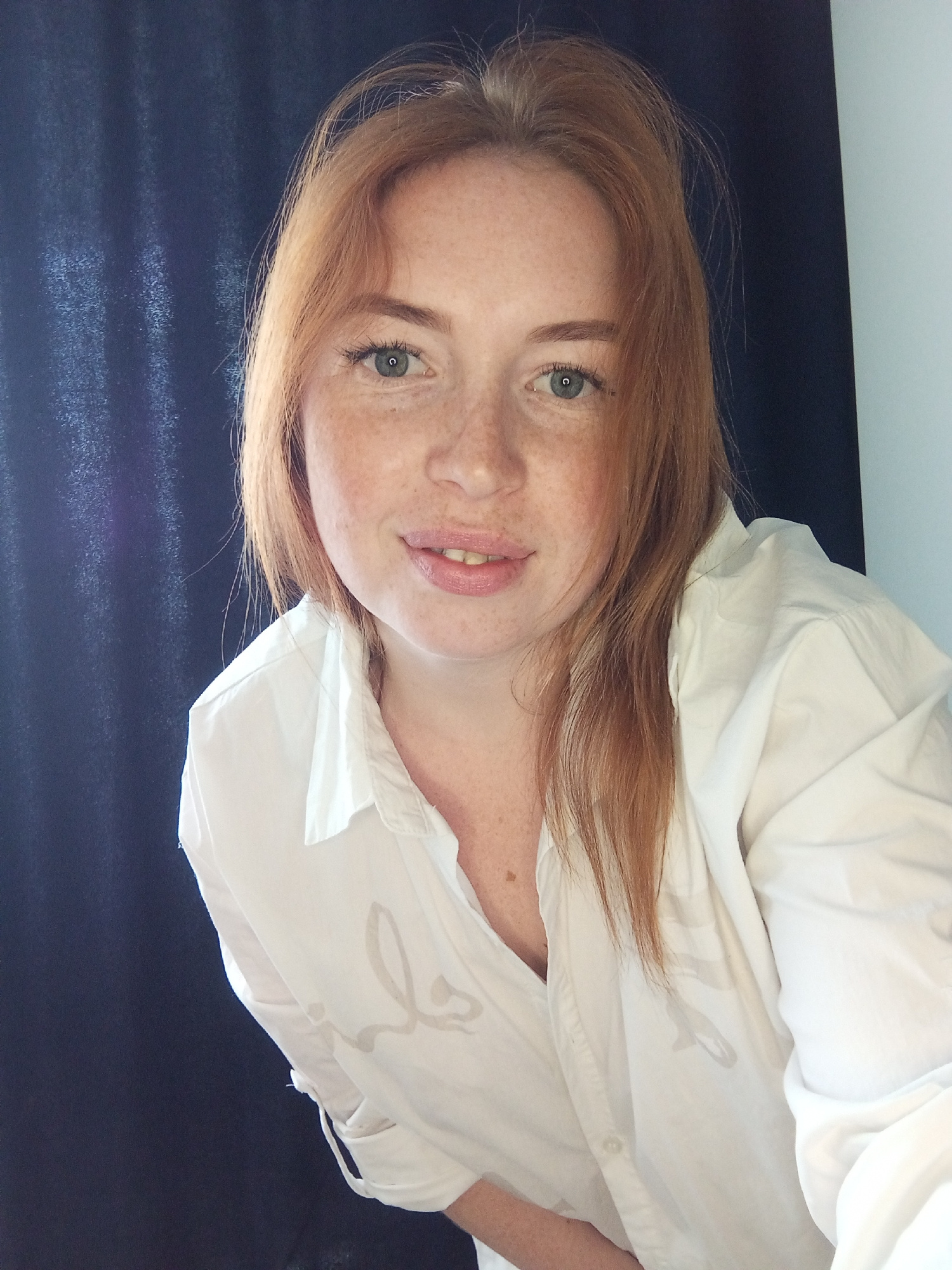 A light-skinned woman with freckles and reddish-blonde hair is pictured from a close-up, slightly angled perspective. She is wearing a white button-down shirt, partially unbuttoned. The background app…read more
