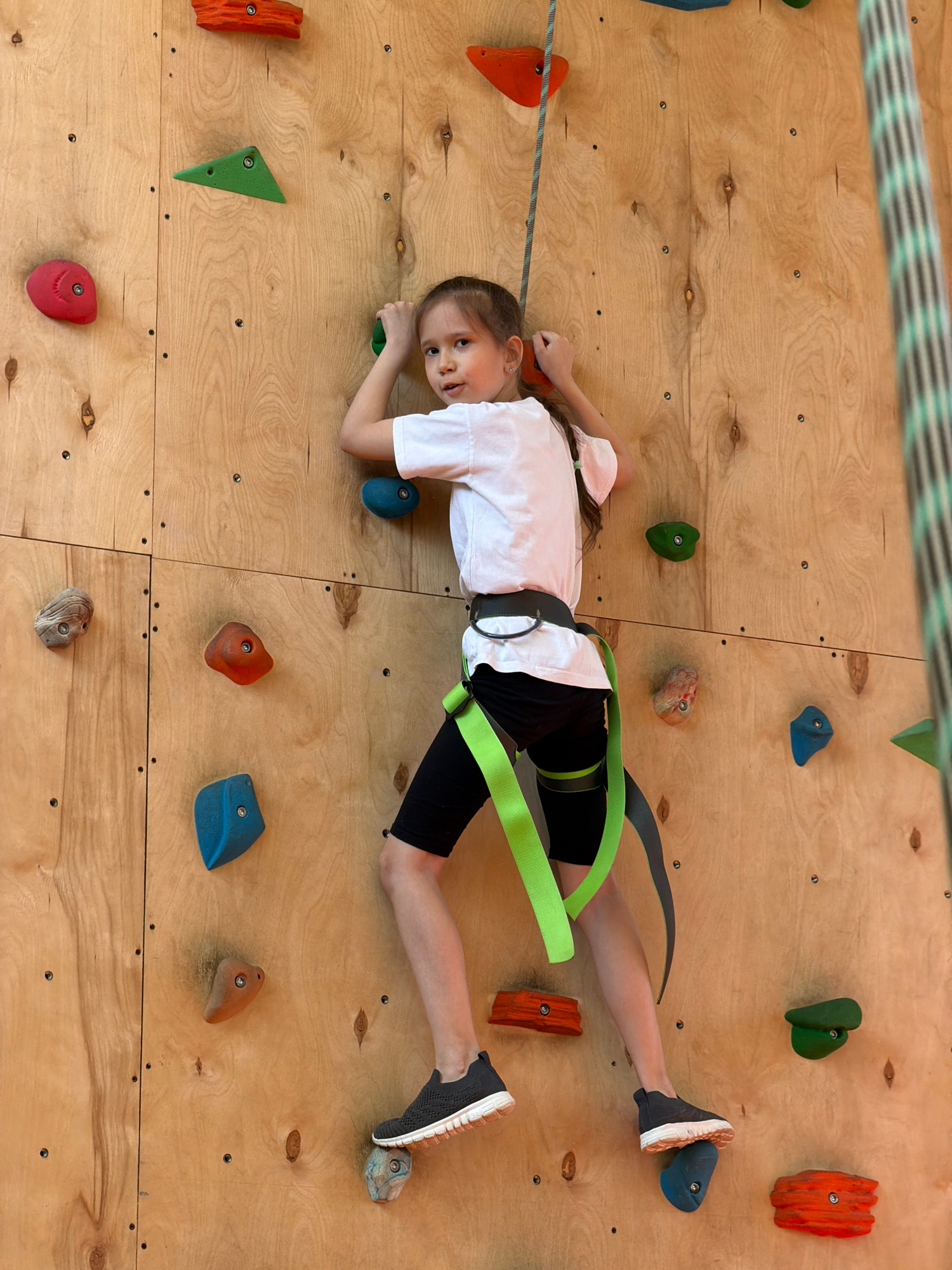 A young girl is positioned horizontally on a wooden climbing wall, wearing a white T-shirt, black shorts, and gray shoes. She is secured with a green and gray safety harness. Her feet are placed on cl…read more