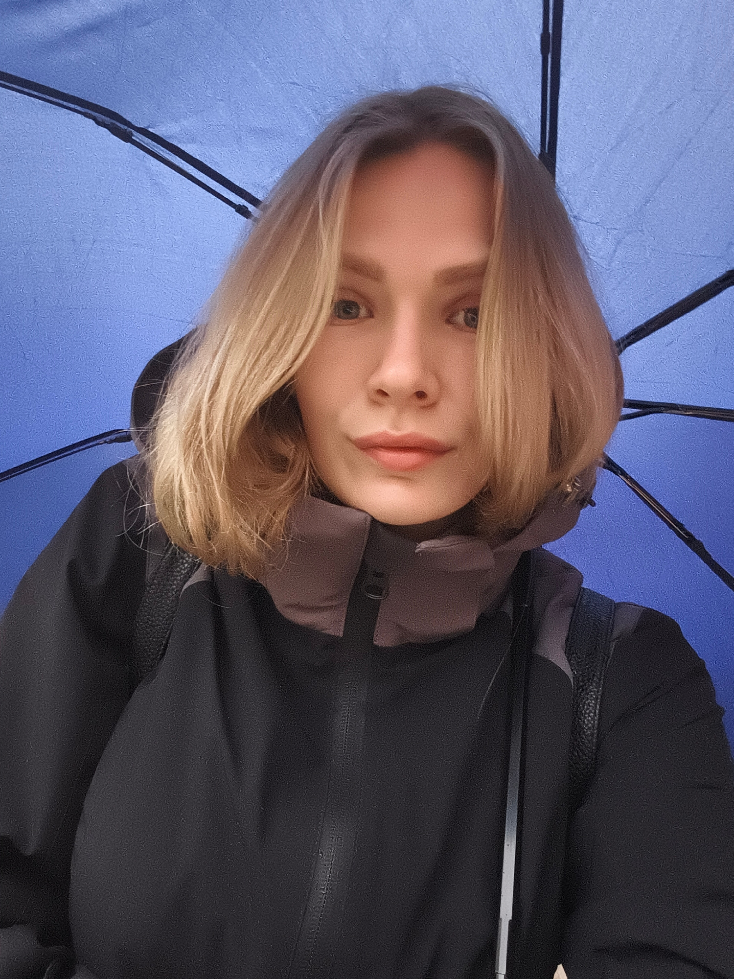 A woman is taking a selfie under a blue umbrella. She is wearing a black jacket with a gray collar and a black backpack. She has short blonde hair and light eyes. The location is not discernible as Iz…read more