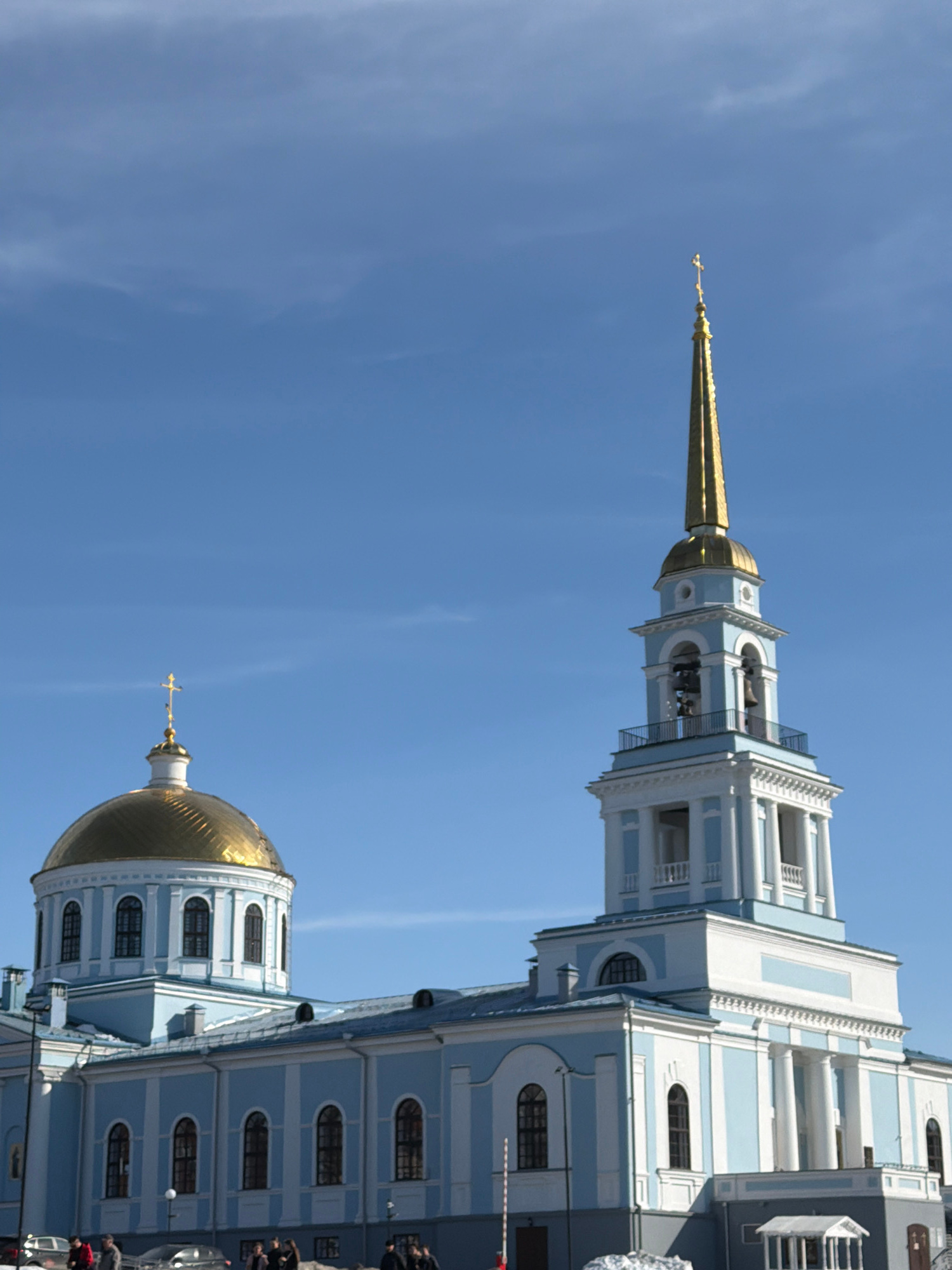 The image depicts the Annunciation Cathedral in Votkinsk, Russia. The cathedral features a blue and white exterior, a golden dome on one end and a tall, gold-tipped spire on the other. There are sever…read more