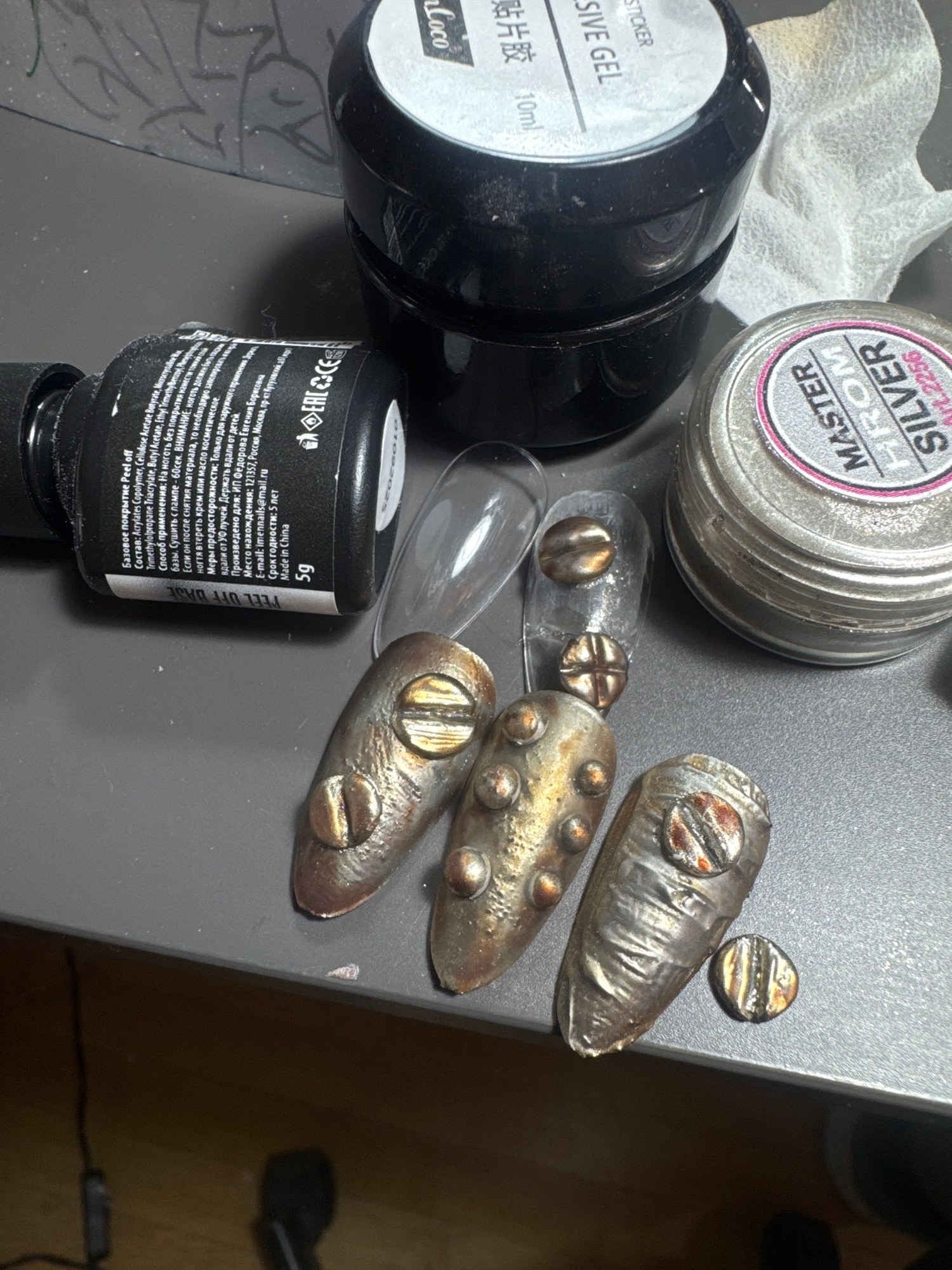 The image displays a close-up, top-down view of nail art supplies and decorated nail tips laid out on a dark grey surface, likely a desk or workbench. In the upper left, a black cylindrical bottle is…read more