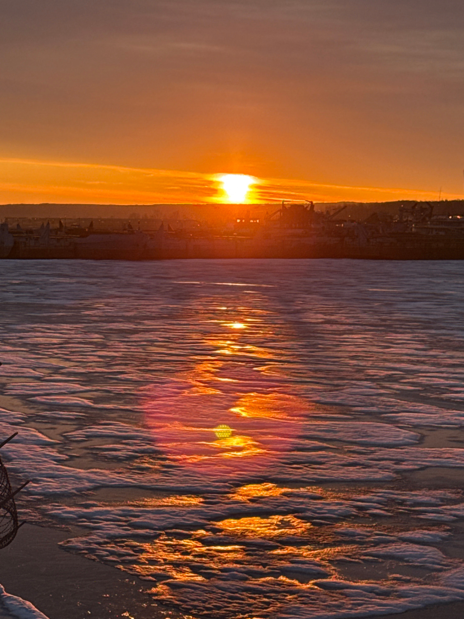 The image depicts a sunset over the Kama River in Chaikovsky, Russia. The sun is setting on the left side of the frame, casting a bright orange glow over the city skyline. The reflection of the sunset…read more