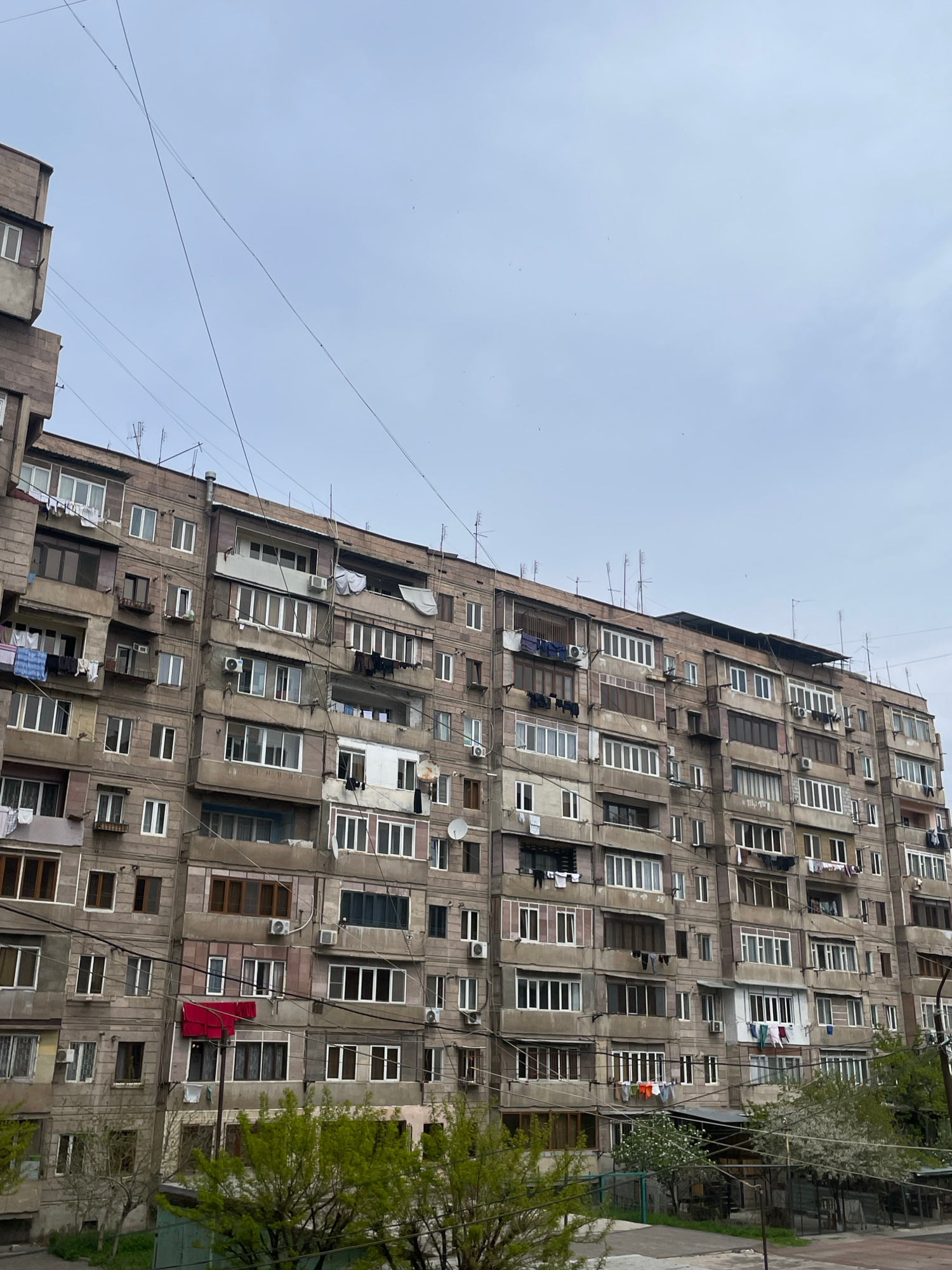 The image depicts a high-rise apartment building in Yerevan, Armenia. The building is characterized by its repetitive window patterns, each unit often featuring unique modifications like different winβ¦read more