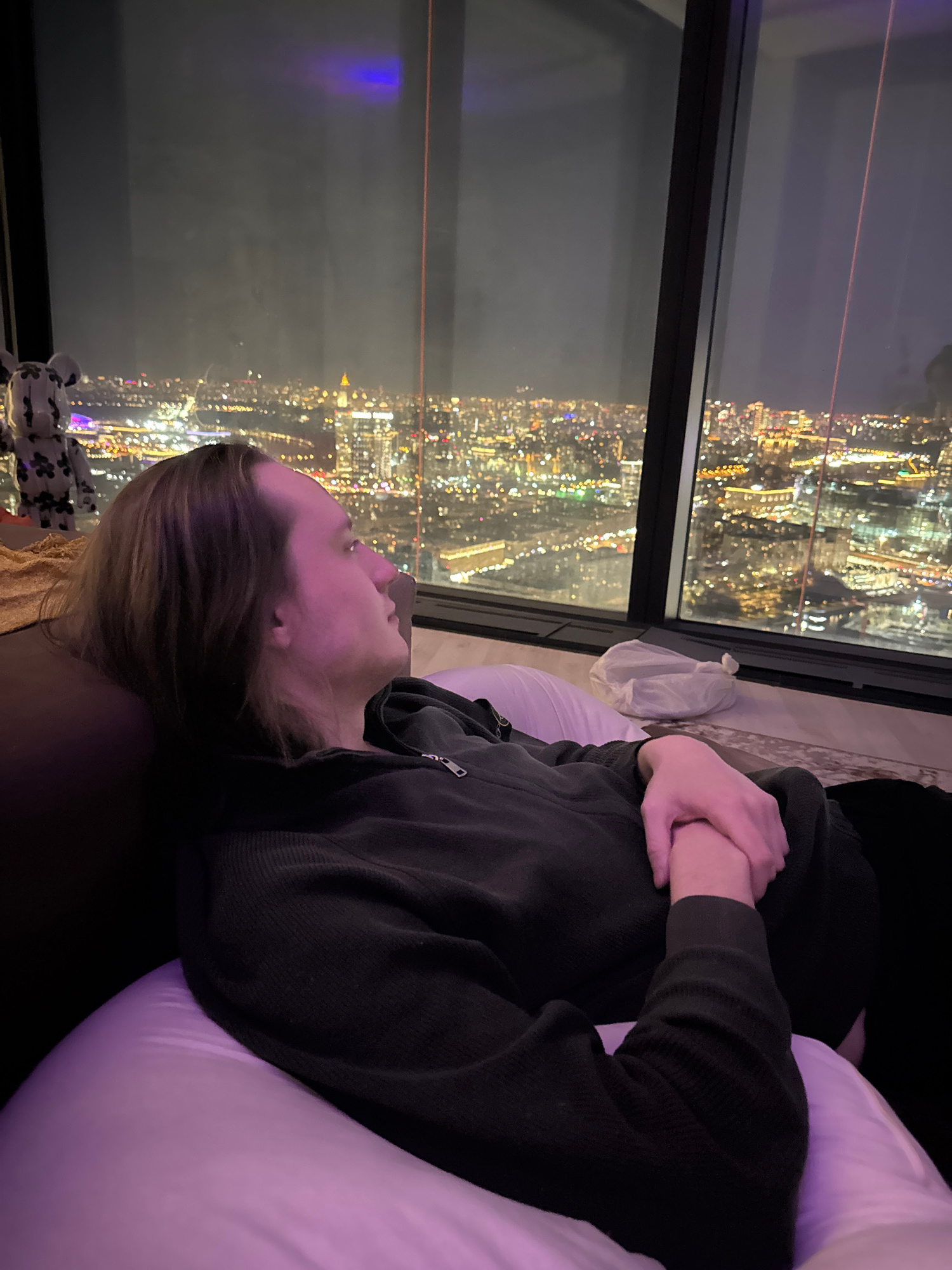 A person is lying down with their face turned towards a large window that offers a nighttime view of a city. The person has fair skin and light brown hair and is wearing a black hooded sweatshirt. The…read more