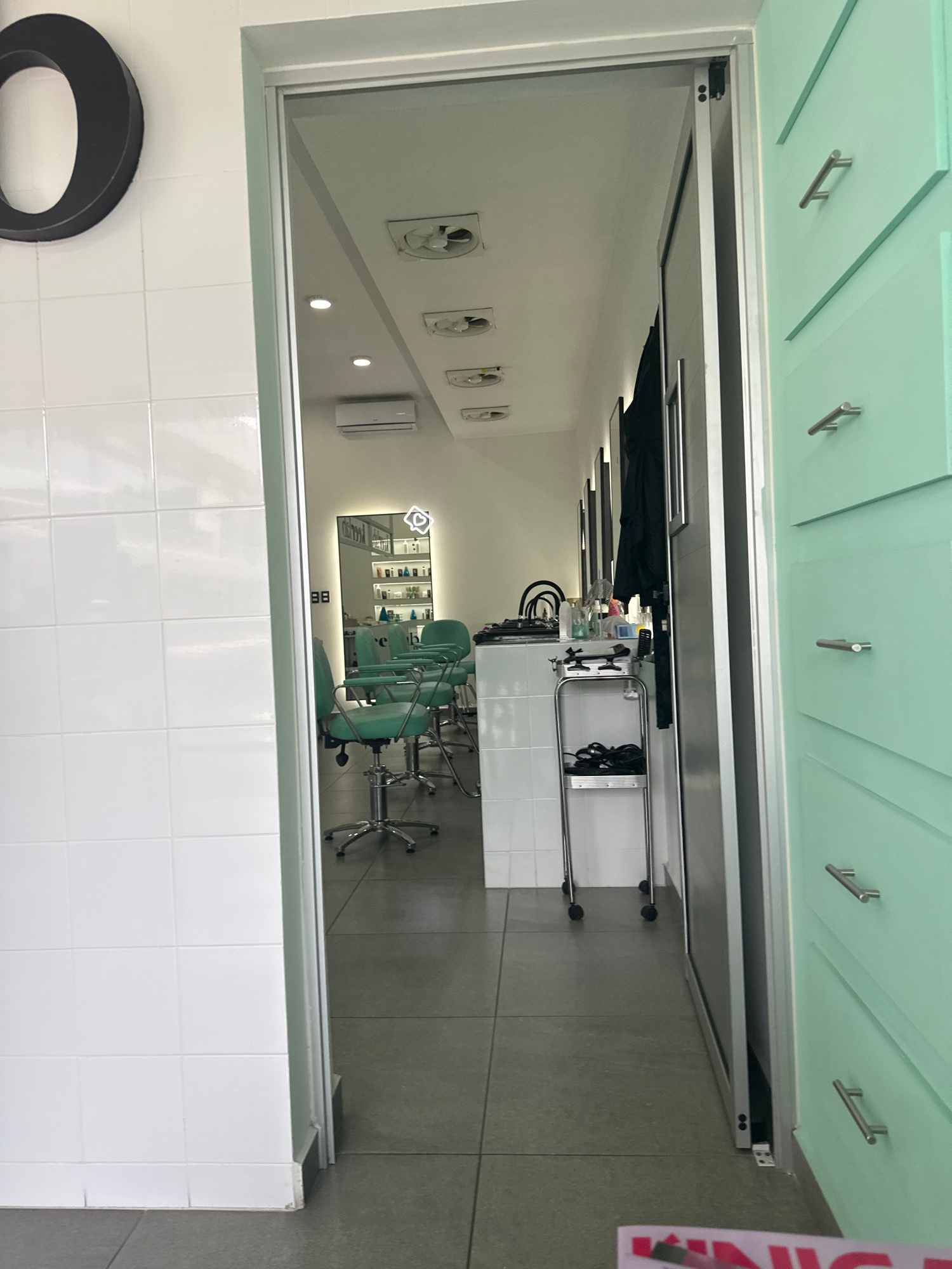 The image captures a view looking into a bright, modern salon or beauty treatment room through an open doorway. The photograph is taken from an area with light-colored flooring, possibly white tiles,…read more