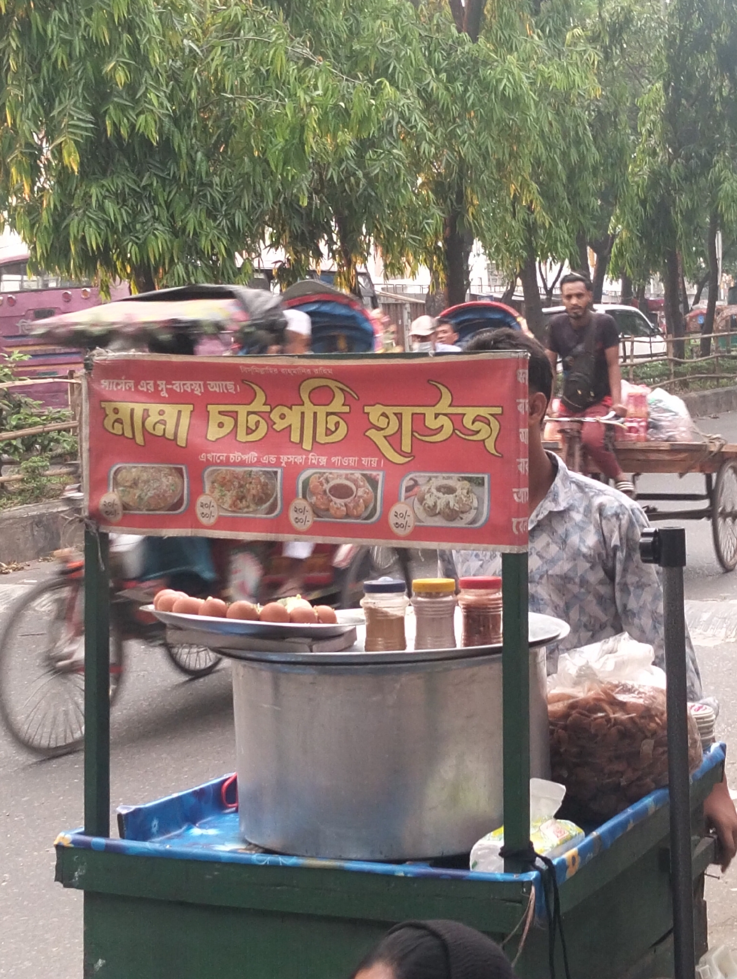 The image shows a street food vendor's cart in Dhaka, Bangladesh. The cart is selling "chatpati," a popular South Asian street food. A sign on the cart reads "Mama Chatpati House" in Bengali and adver…read more