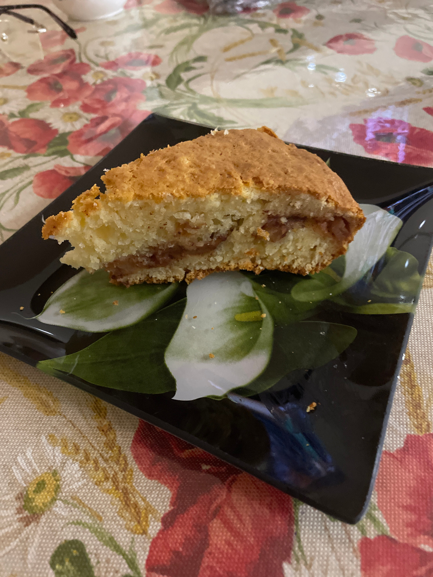 A slice of cake sits on a square black plate decorated with white lilies and green leaves. The cake has a light brown crust and a filling, appearing to be on a tablecloth with a floral pattern, featur…read more