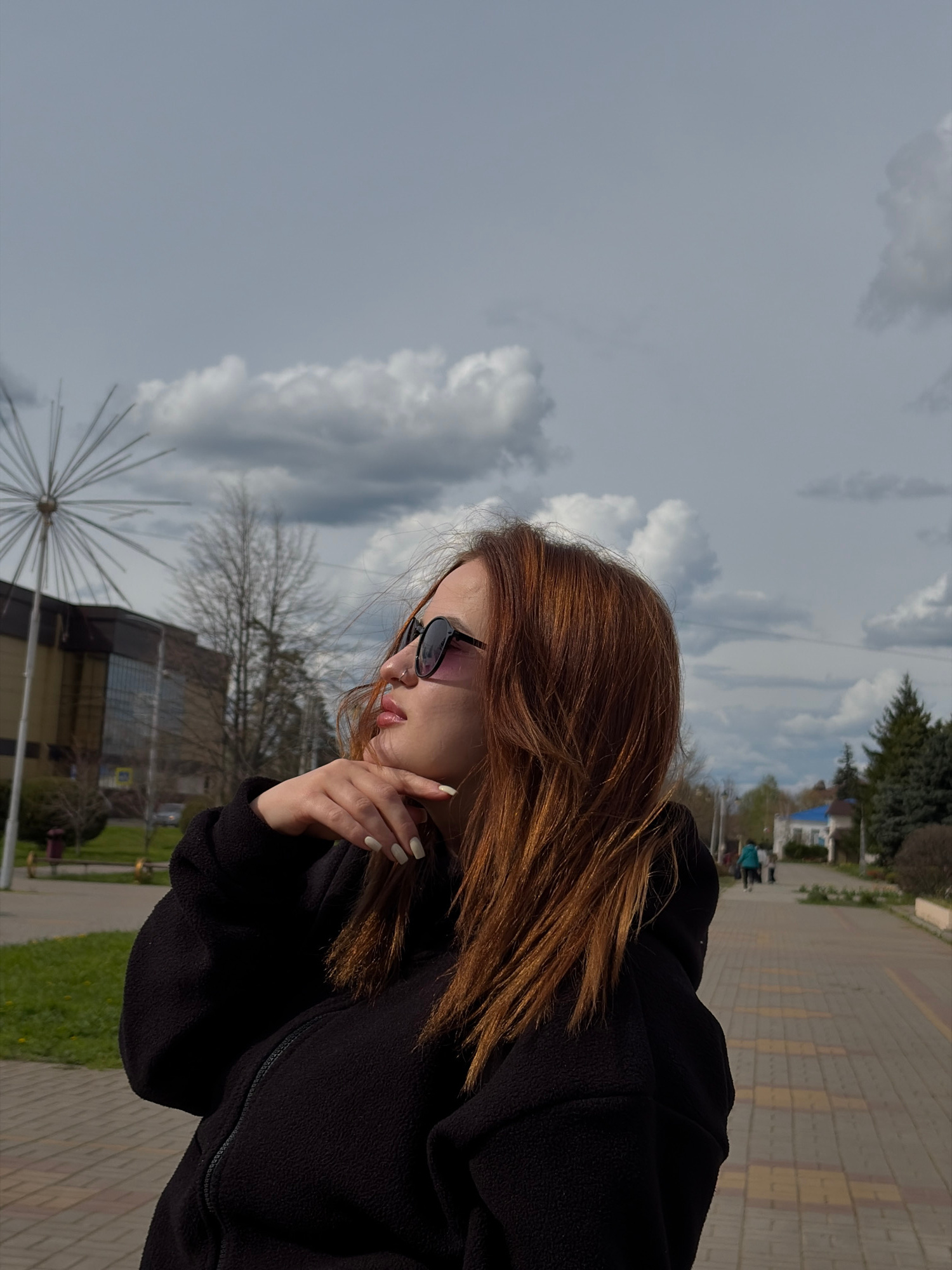 A medium shot captures a person with auburn hair and sunglasses, wearing a black hooded jacket. The person is gazing downward with their hand near their face. The background reveals an urban landscape…read more
