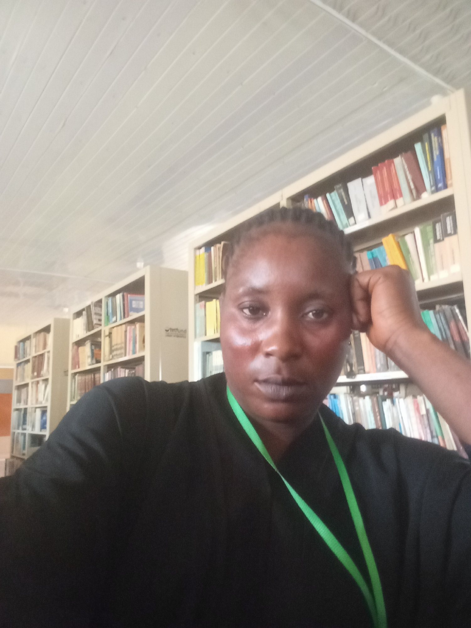 A selfie shot shows a woman with dark skin and braided hair, resting her head on her hand. She wears a black garment and a green lanyard. Behind her, shelves of books indicate she is likely in a libra…read more