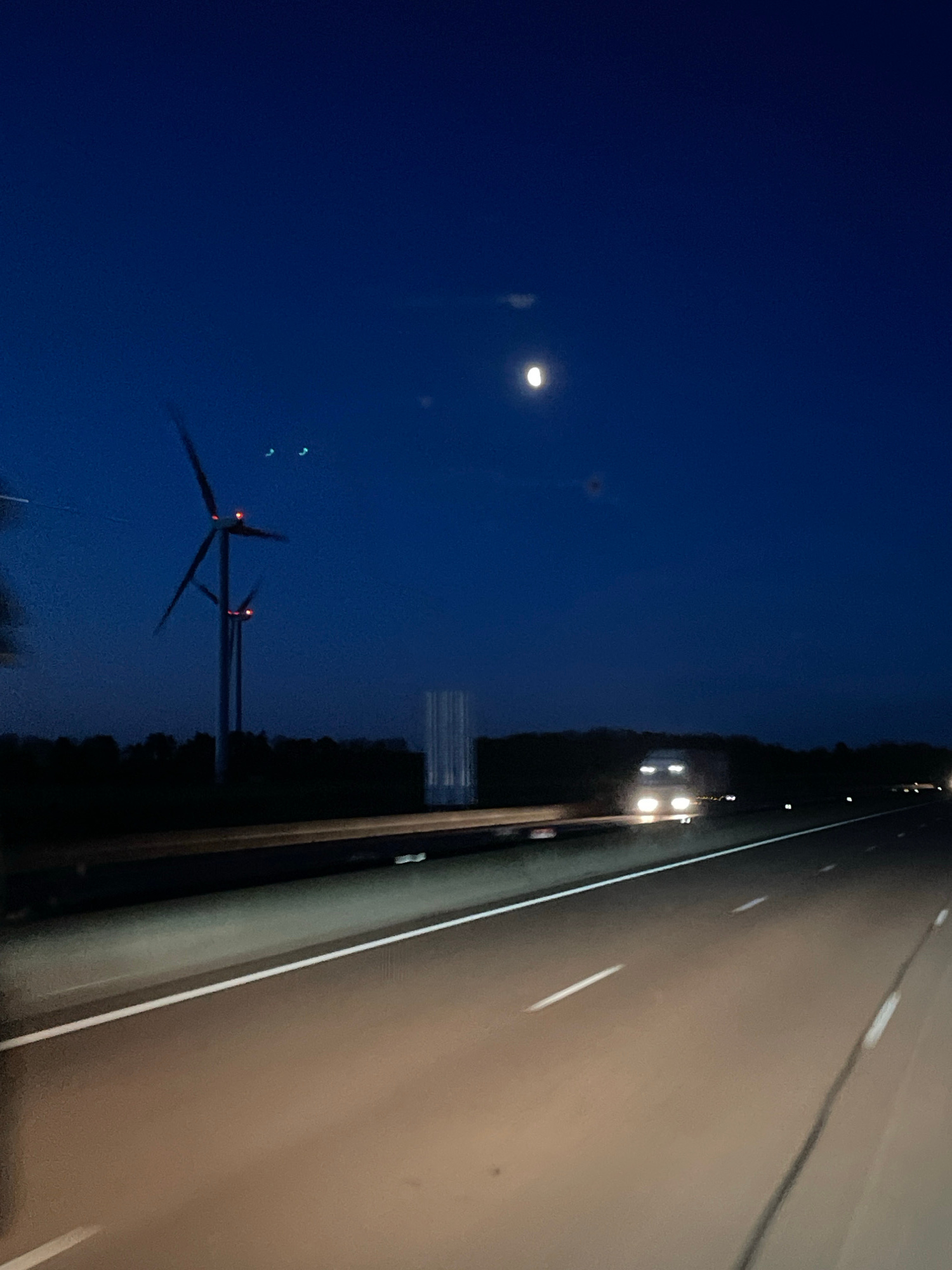 The image shows a view from inside a vehicle, likely a car, driving at night. To the right is a multi-lane highway with white lane markings. The shoulder of the road is lined with trees and utility po…read more