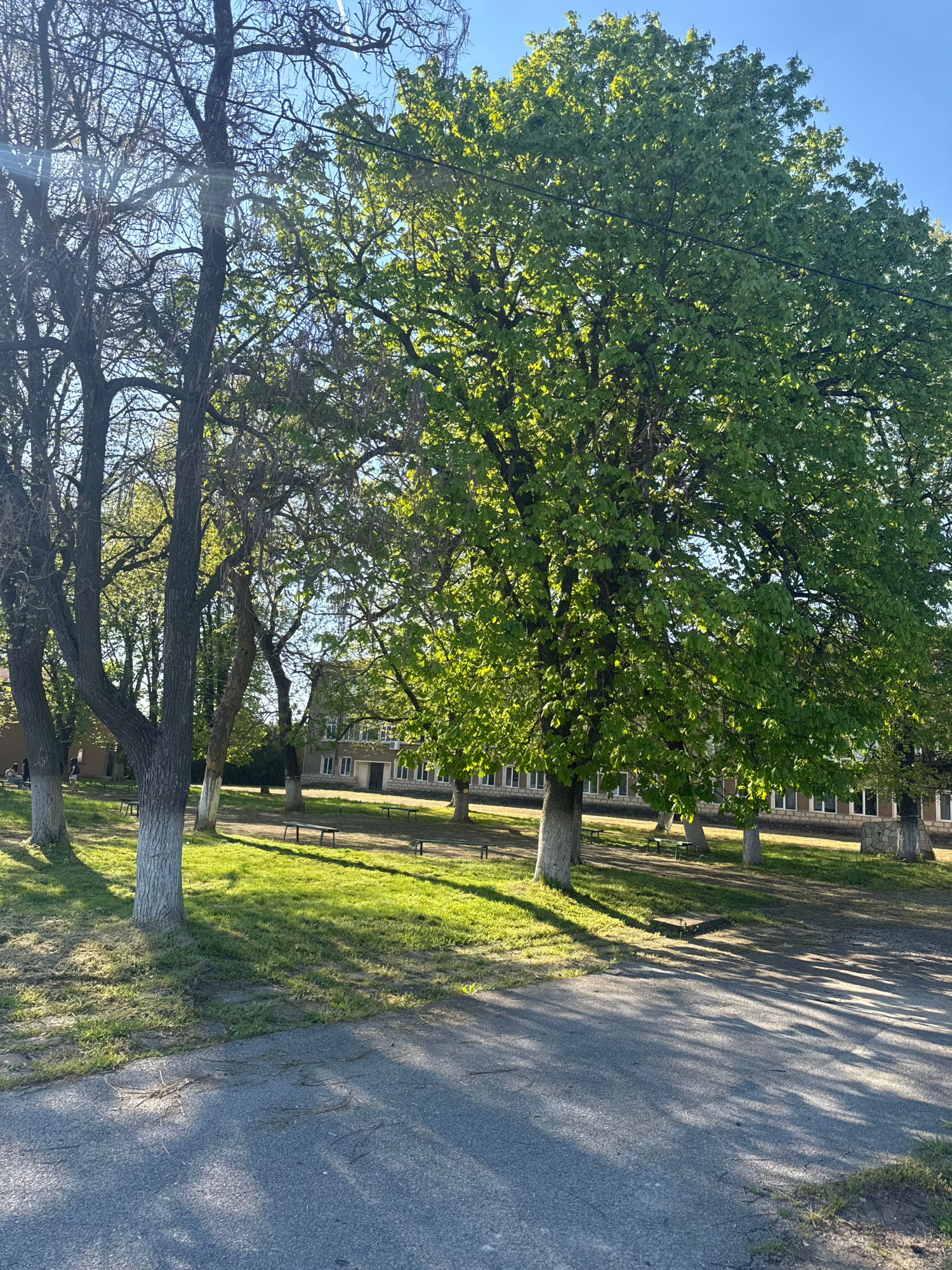 The image presents a serene outdoor scene, likely a park or grounds in Lehchevo, Bulgaria, under bright sunshine. Several large, mature trees dominate the foreground and midground, with some fully leaβ¦read more