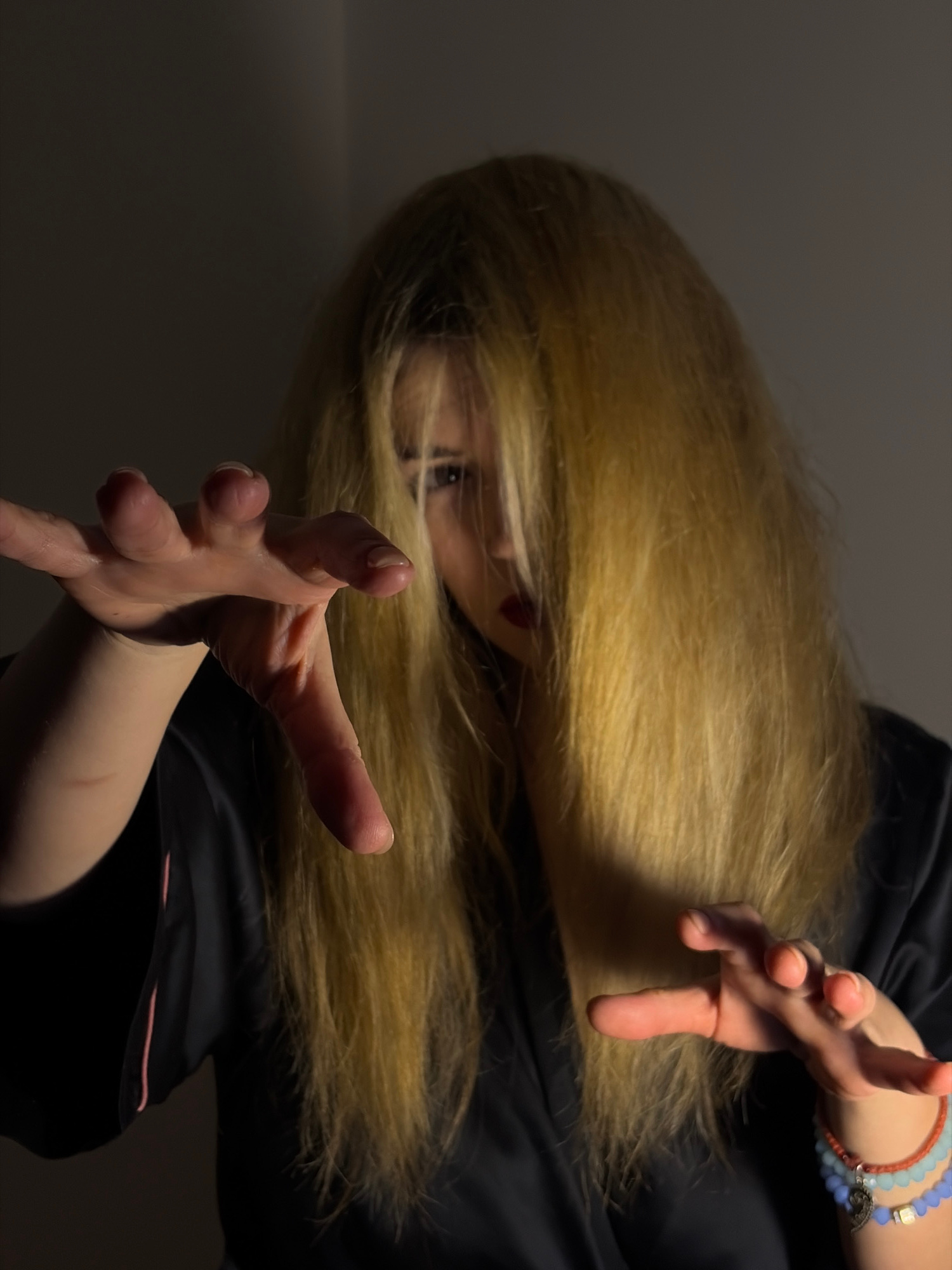 A person with long, blonde hair, wearing a dark robe, is captured in a low-angle shot against a dark background. Their face is partially obscured by their hair, but one eye and red lips are visible. B…read more