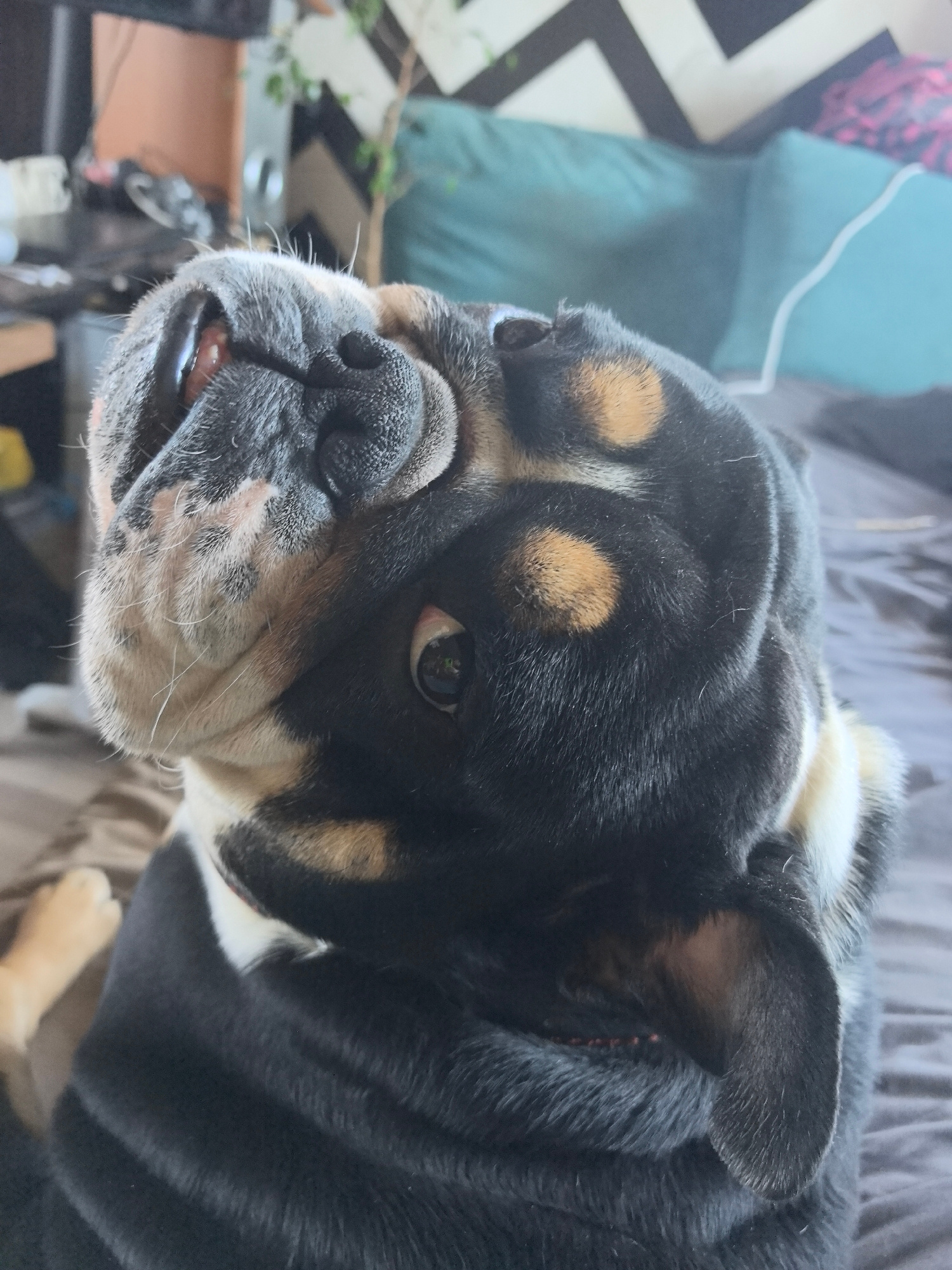 A close-up, medium-shot of a bulldog tilting its head. The dog has a dark coat with tan markings on its head and white fur around its muzzle. Its right ear is visible and droops down. One eye is visib…read more