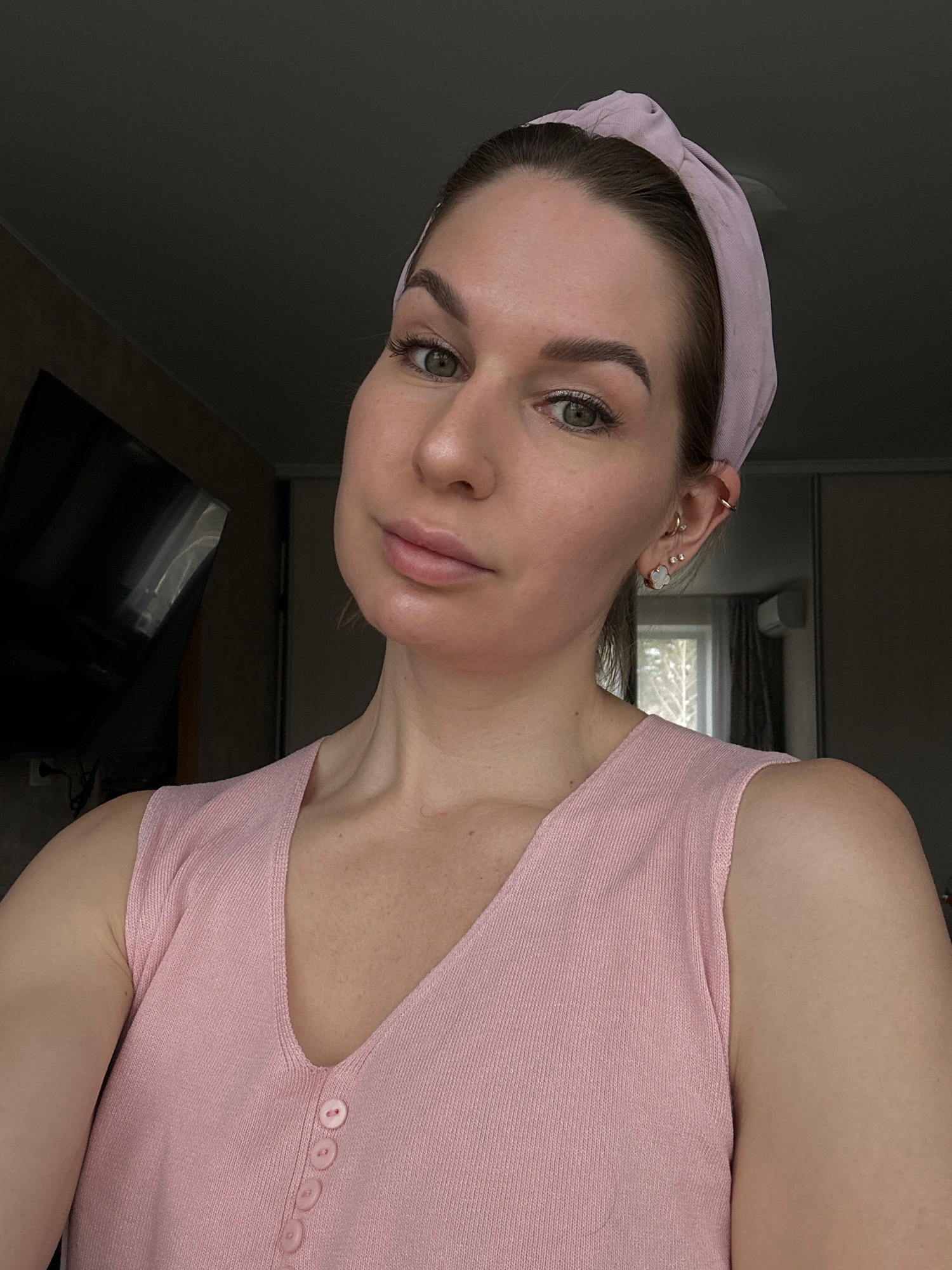 A woman with light skin and brown hair pulled back by a light pink headband poses for a close-up selfie. She is wearing a light pink top with small buttons down the front. She has several earrings in…read more
