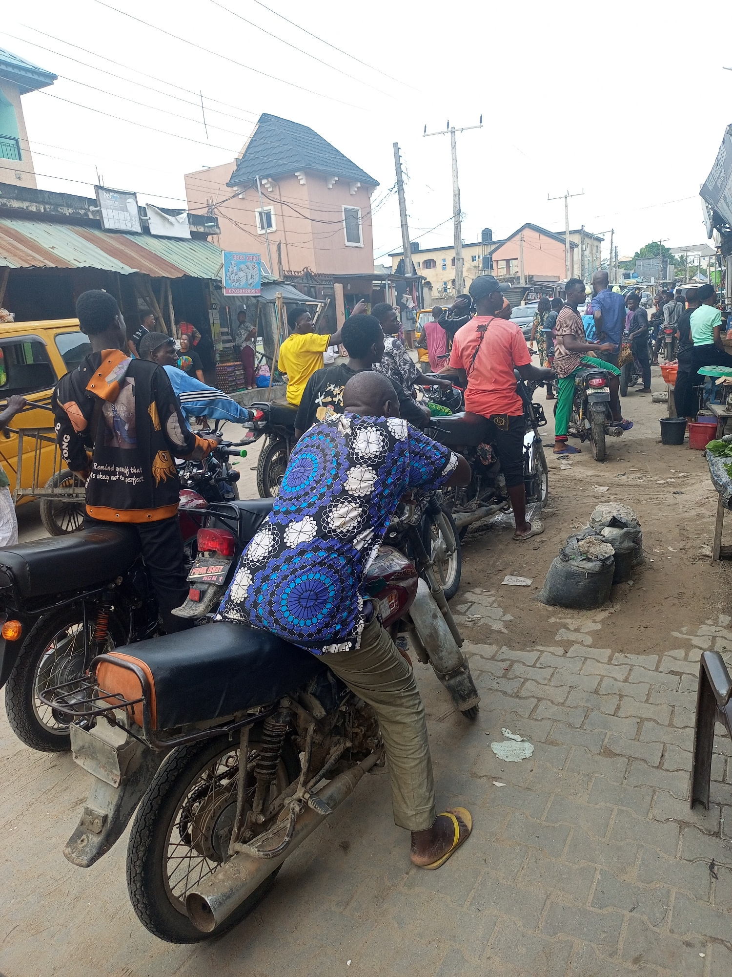 This image depicts a bustling street scene in Satellite Town, Nigeria, under an overcast daytime sky. The setting features a combination of block-paved and unpaved ground, lined with single and two-st…read more