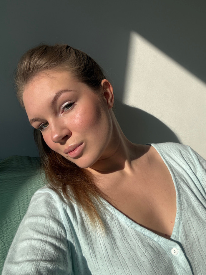 A young adult female is depicted in a close-up, indoor selfie, located within the city of Vozdovac Urban Municipality, Serbia. She has light skin, light brown hair styled upwards from her forehead, an…read more