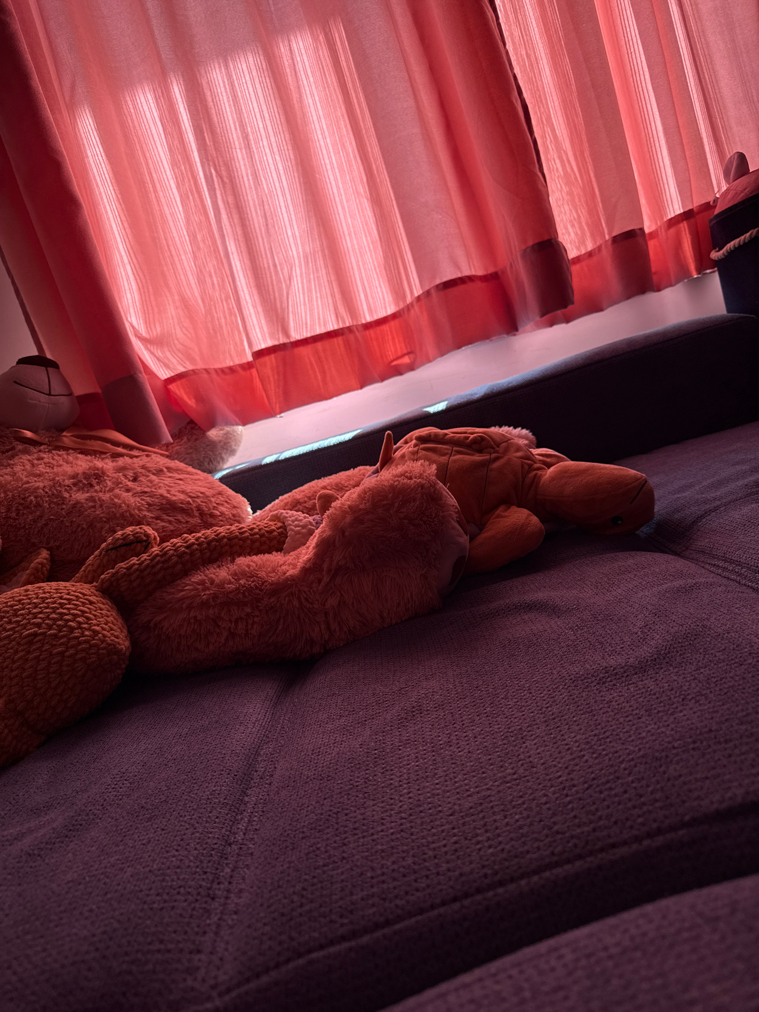 The image shows a close-up view of a domestic scene, likely indoors. On the left, textured, salmon-colored curtains with visible folds are partially drawn. Next to the curtains is a dark grey or purpl…read more