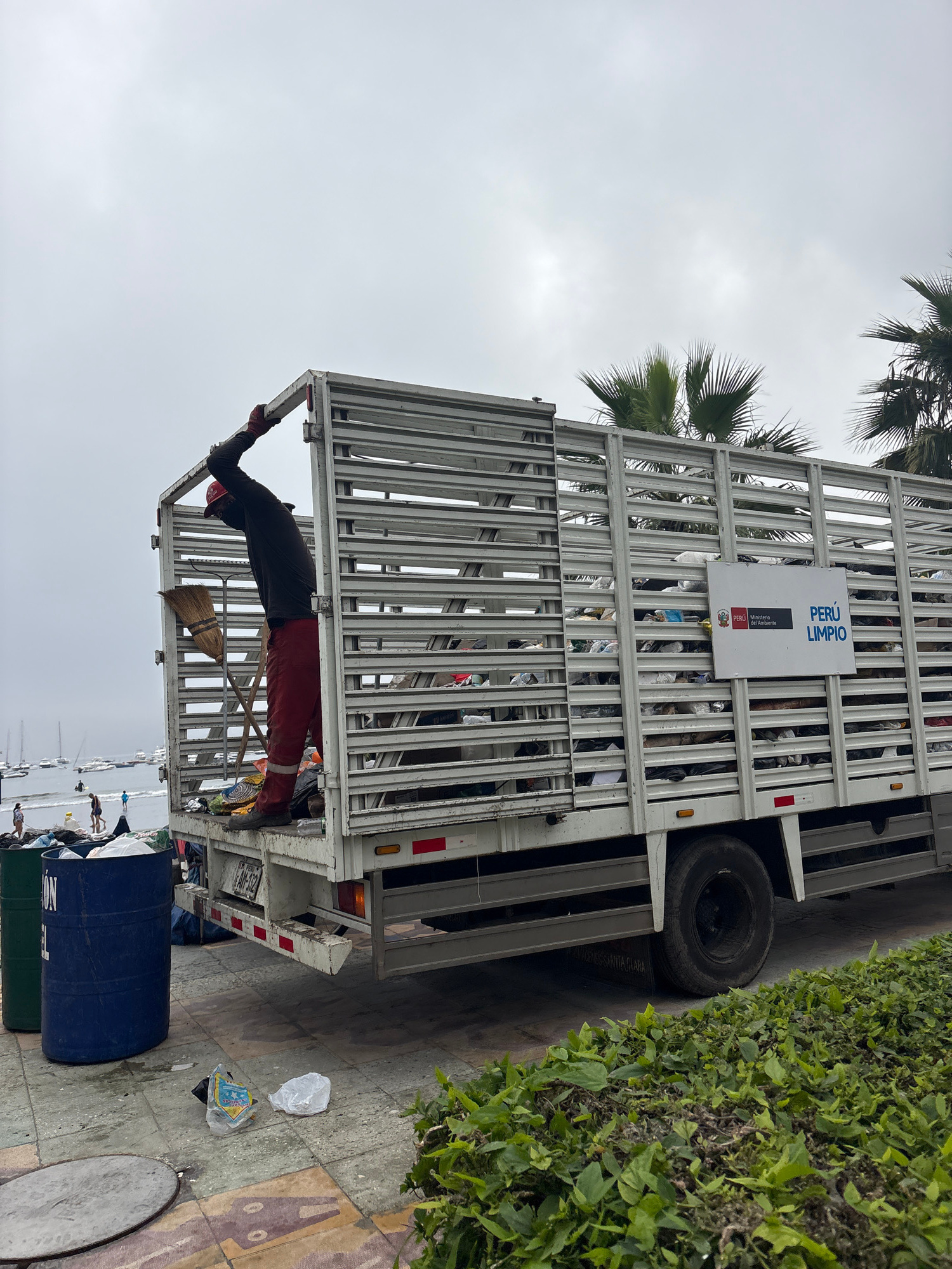 A street scene in Ancón, Peru, under an overcast sky, shows a white truck with a metal cage body parked along a sidewalk. The cage is filled with trash bags. A sign on the truck reads "PERÚ LIMPIO" ("…read more
