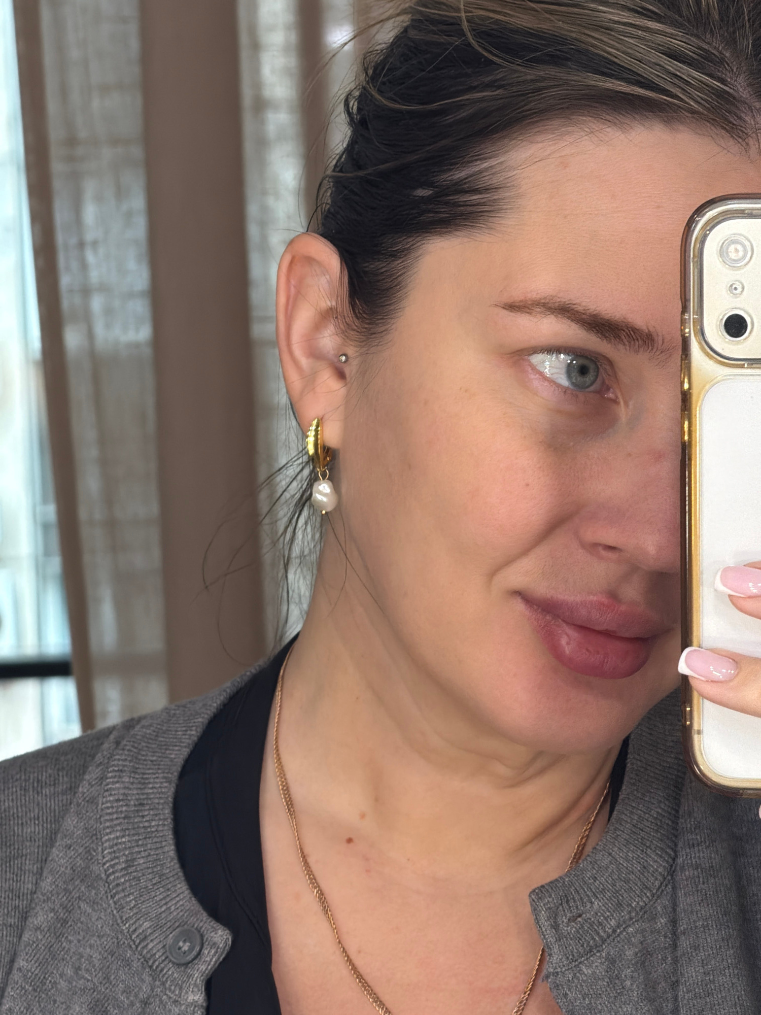 The image is a close-up self-portrait of a woman with light skin, blue eyes, and dark hair. The woman is holding a cell phone, which is positioned so that the camera is near her forehead. The woman ha…read more