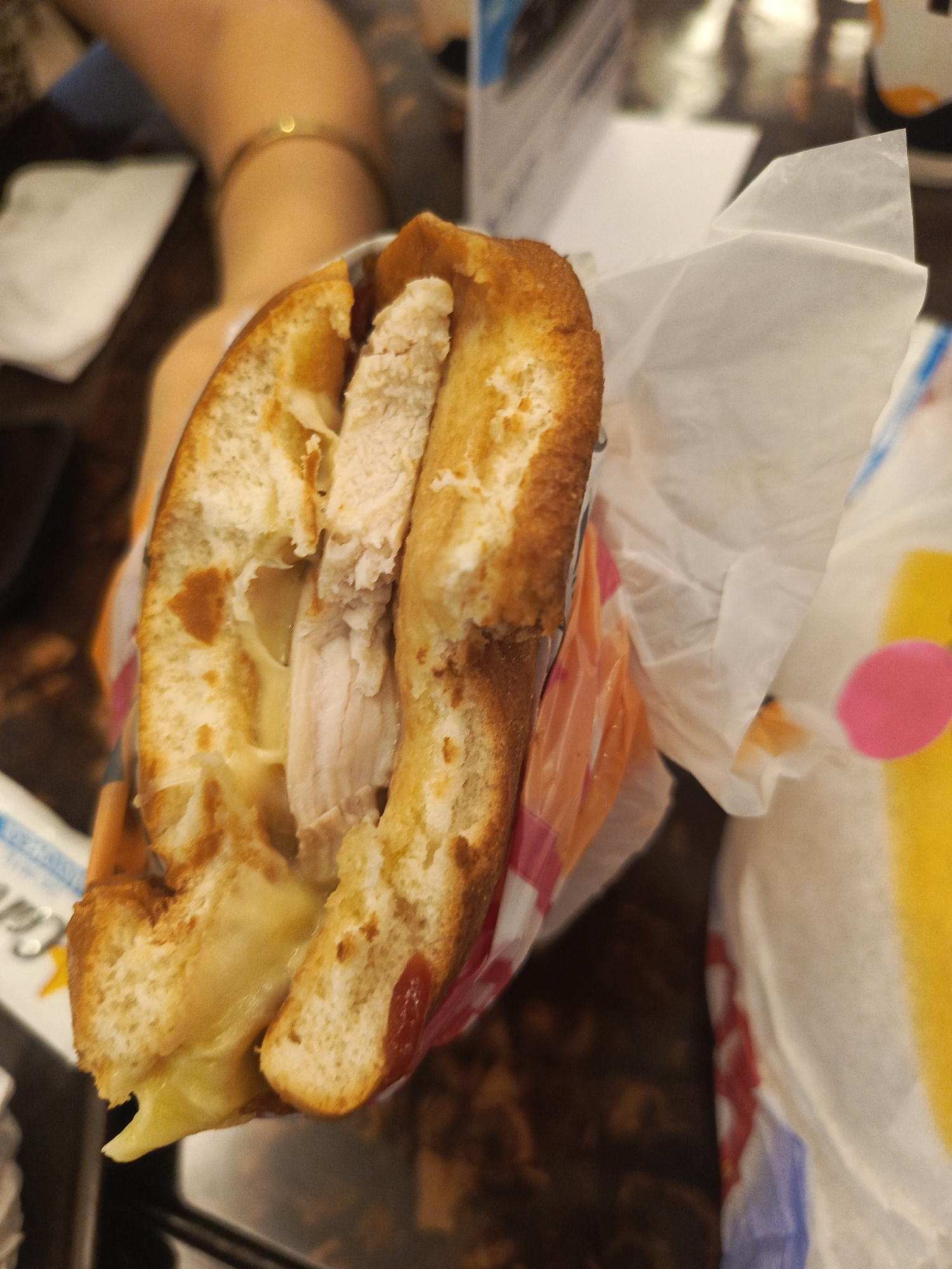 A close-up, slightly tilted shot focuses on a toasted sandwich, cut in half and held by a person. The sandwich features golden-brown bread, revealing generous slices of cooked meat, likely turkey or chicken, along with gooey melted cheese that visibly oozes from the bottom. A hint of red sauce is also visible on the interior of the bread. The sandwich is partially encased in white paper or plastic packaging. In the blurred background, a person's arm is visible, adorned with a gold bracelet or ring. The setting appears to be indoors, with a dark table surface in the foreground and a mix of white paper and colorful packaging (featuring yellow, pink, and blue/white patterns) in the background. Partial text reading "Car" is visible on a white object in the lower-left. The image depicts a casual meal, possibly at a cafe or restaurant, and based on the provided context, it could be taking place in Samborondón, Ecuador. | Open Wire