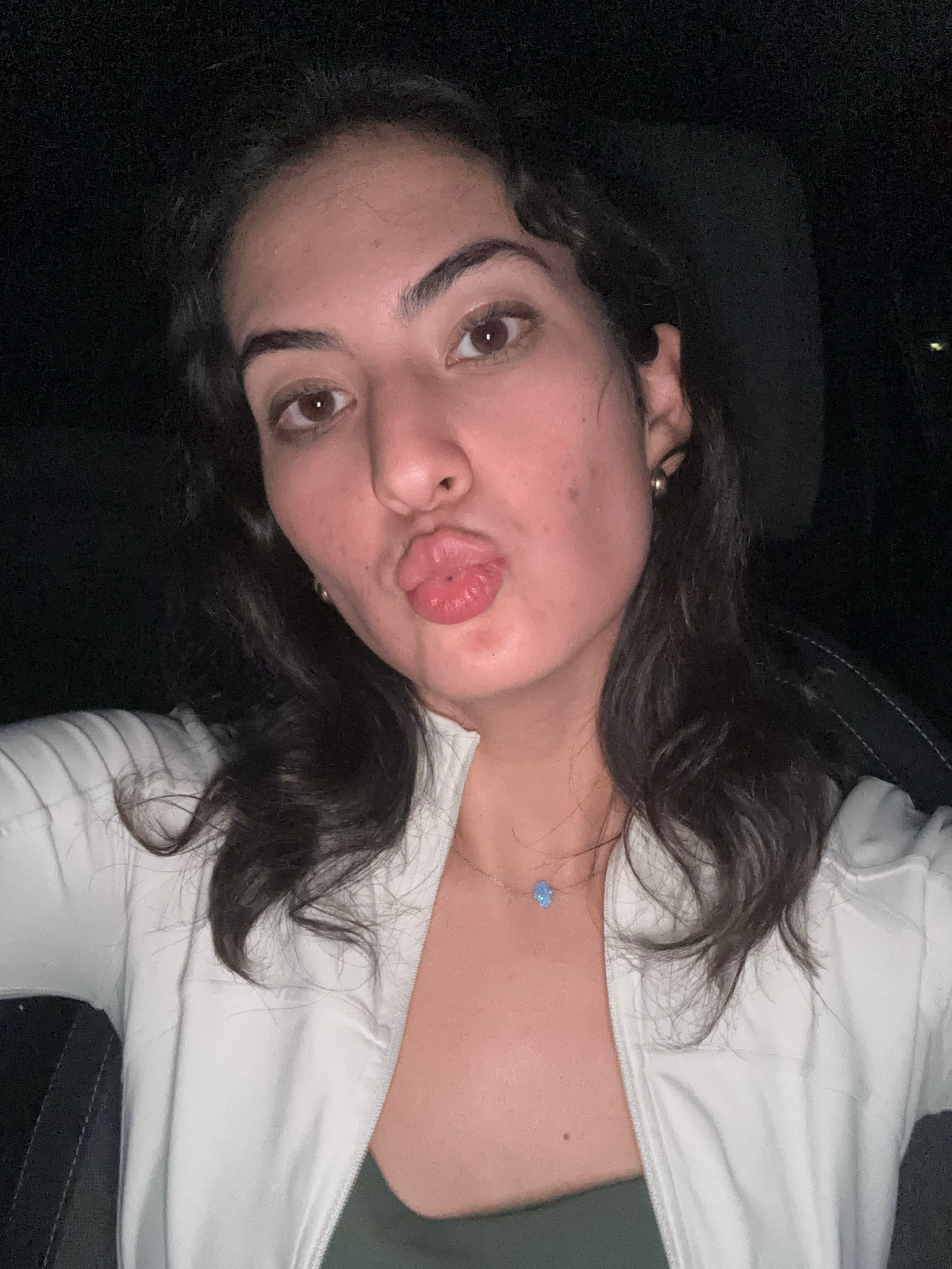 A young woman with dark hair and brown eyes is making a kissing face at the camera. She is wearing a white jacket and a green top. She is also wearing a necklace with a blue pendant. The background is…read more