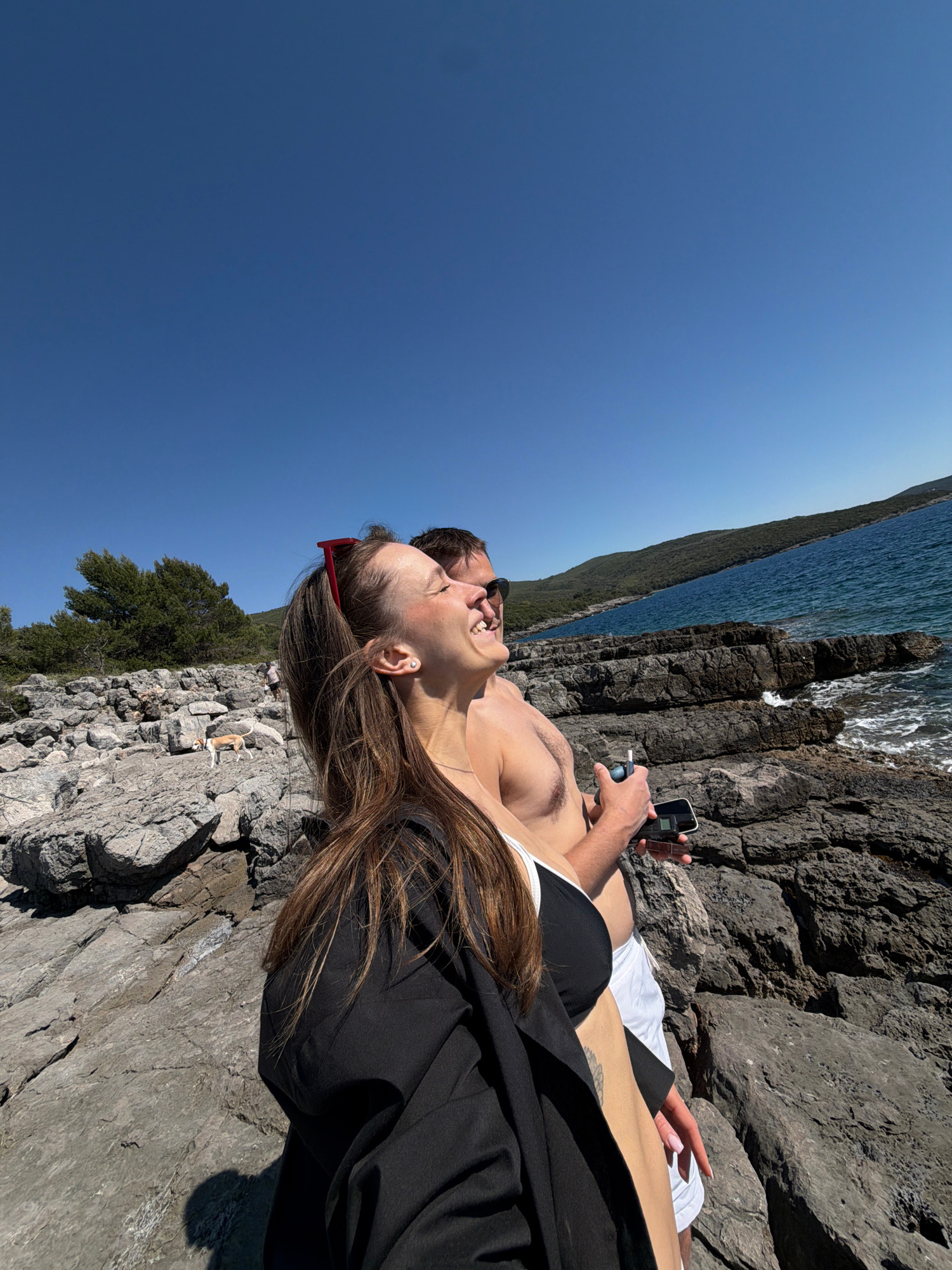 A couple is sunbathing on a rocky coast in Milovići, Montenegro. The woman, with long brown hair and red sunglasses perched on her head, is lying on her side, smiling and facing the sky. She is wearin…read more