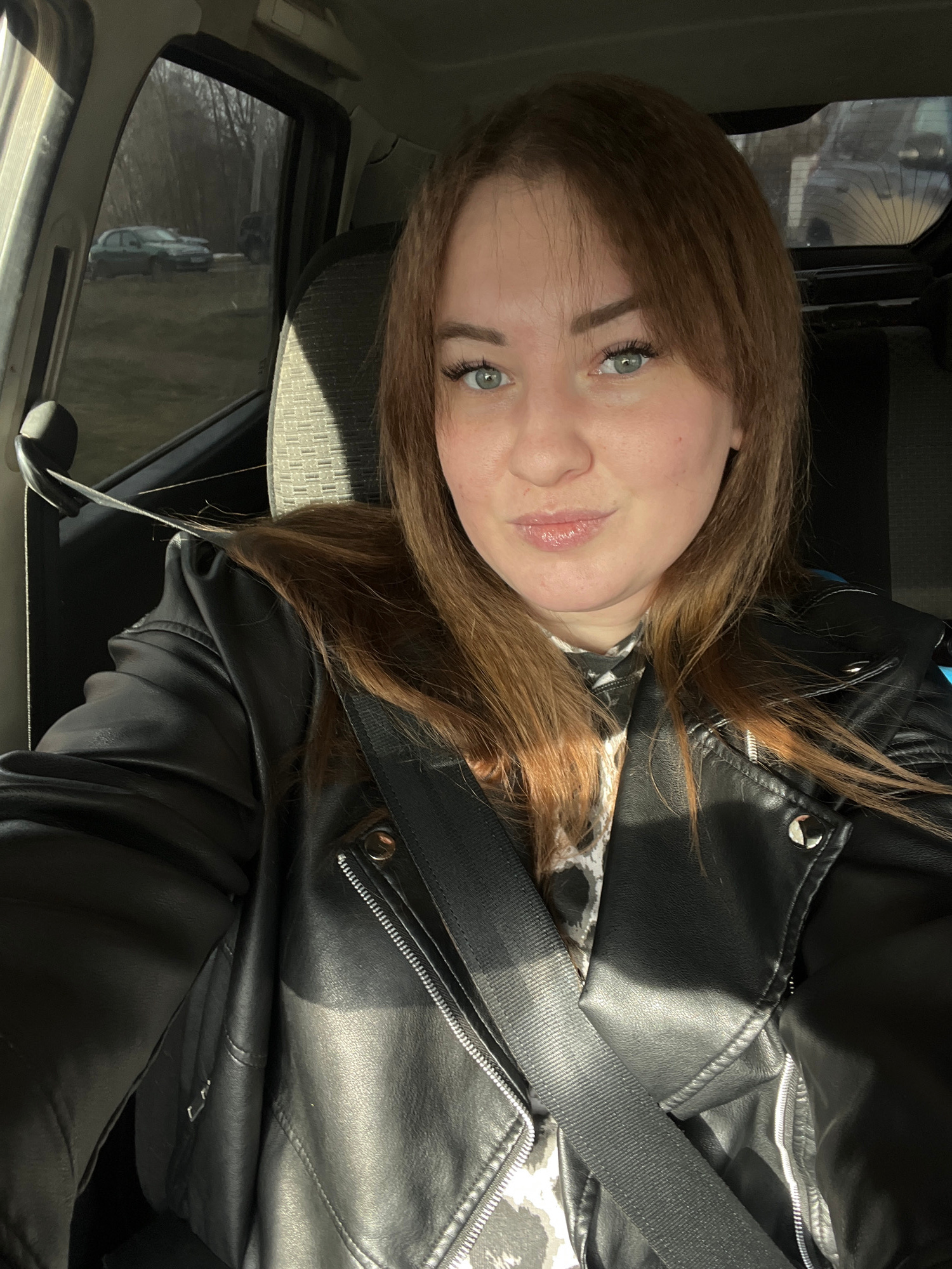 A young woman with shoulder-length reddish-brown hair and light eyes is photographed from a close-up, slightly angled perspective. She is wearing a black leather jacket over a patterned top and is sec…read more