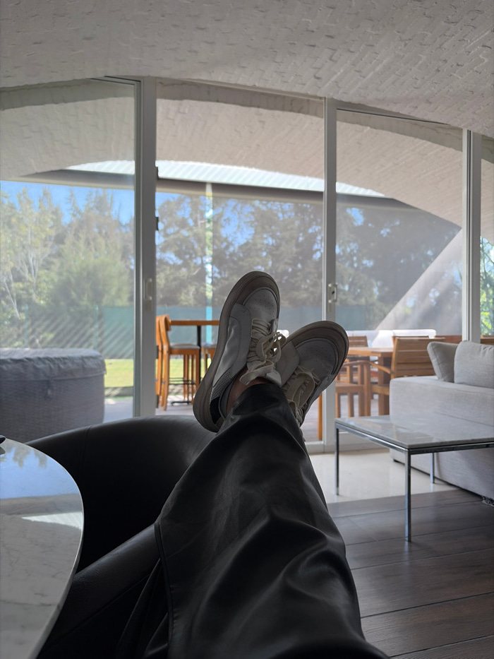A person wearing white sneakers and dark gray pants sits in a black chair, legs extended towards a window. The window reveals a view of greenery and a blurred patio setting. A partially visible white…read more