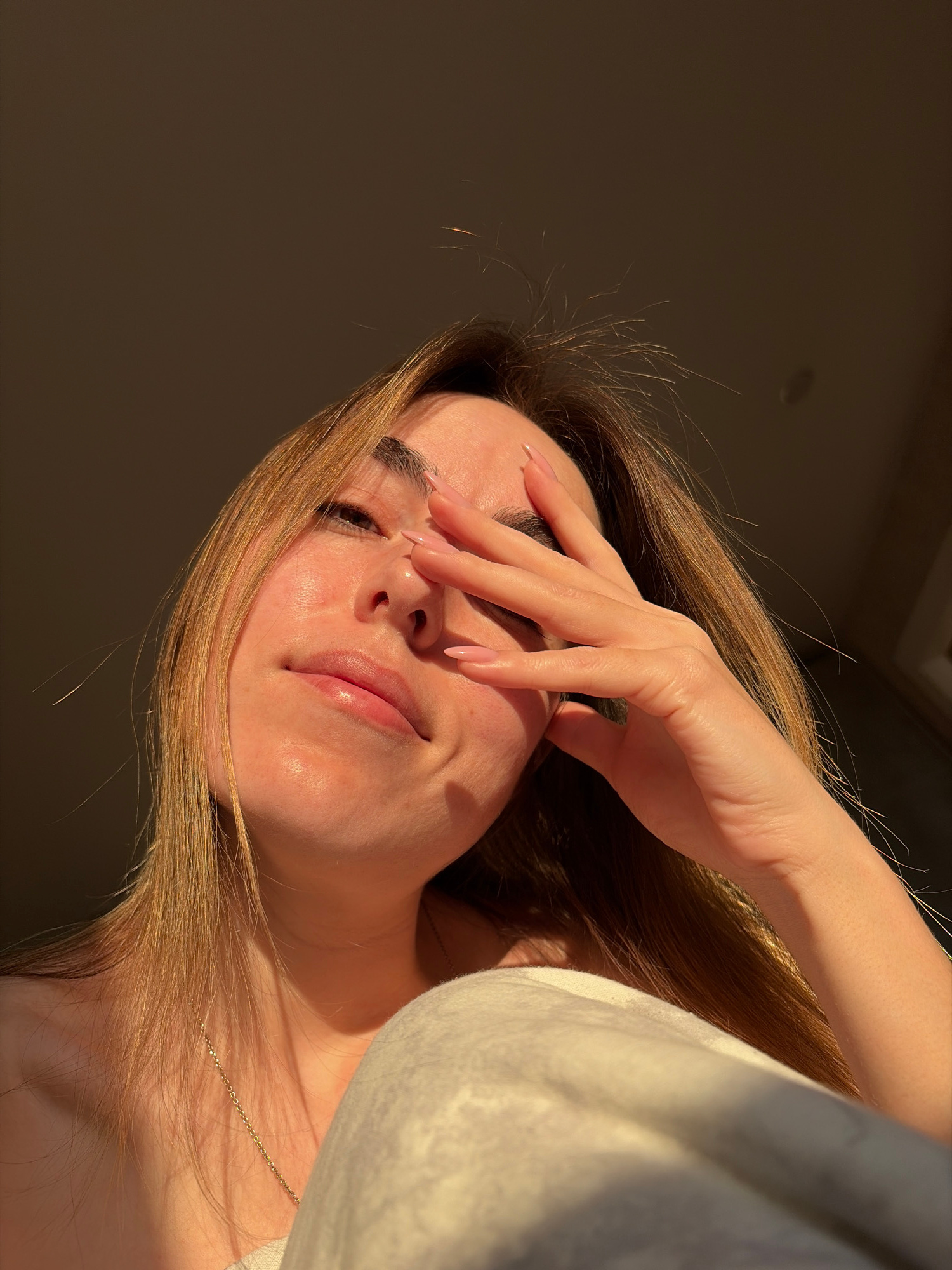 The image depicts a woman with long, light brown hair partially obscuring her face. Her hand is raised, covering part of her forehead and right eye. She has fair skin, pink nails, and is wearing a lig…read more