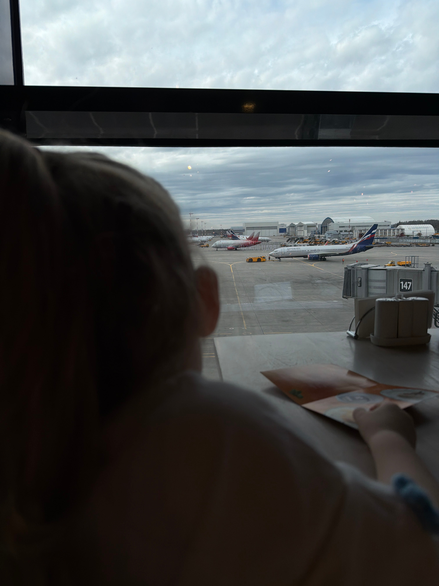 The image shows an airport scene through a window, likely taken from inside an airport terminal or lounge. An airplane is docked at gate 147. Other airplanes and airport infrastructure are visible in…read more