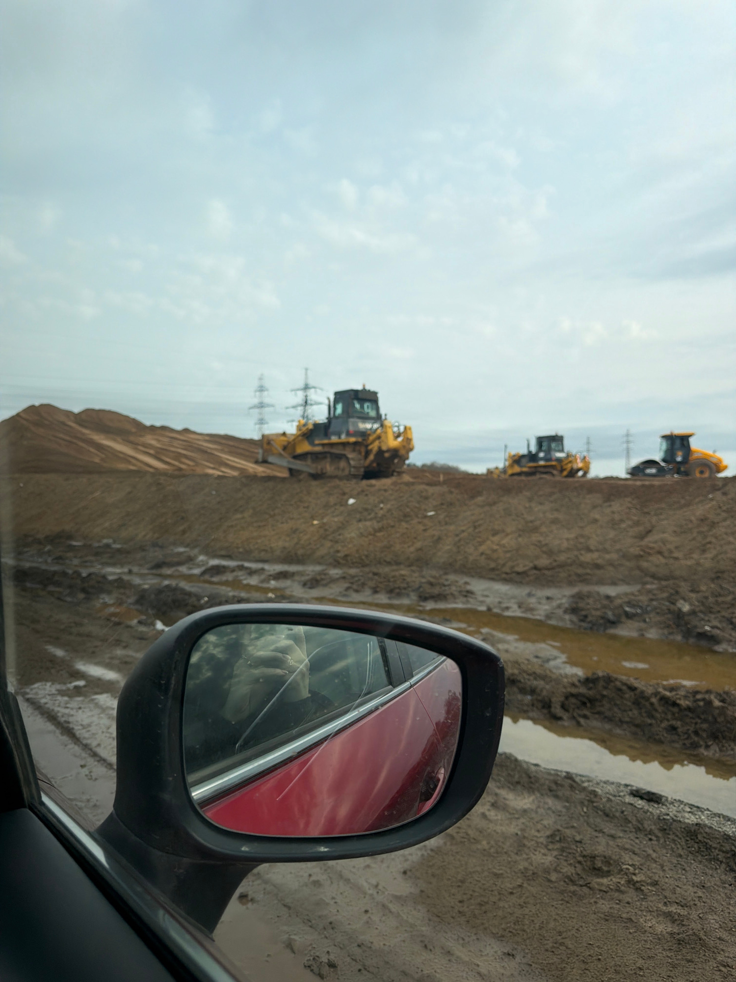 The image, likely taken from inside a car, shows a construction site near Zav'yalovo, Russia. In the foreground, the car's side mirror is visible, reflecting a red car. Beyond the car and the mirror,…read more