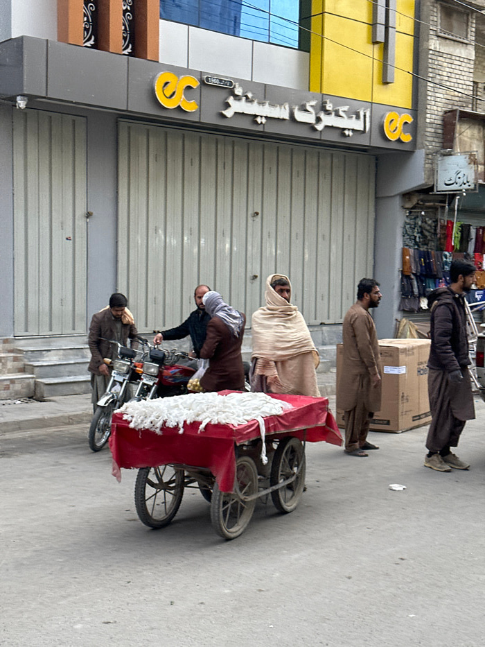 The image depicts a street scene in Quetta City Tehsil, Pakistan, during daylight hours. In the immediate foreground, a red four-wheeled pushcart is stationary on an asphalt road. The cart is covered…read more